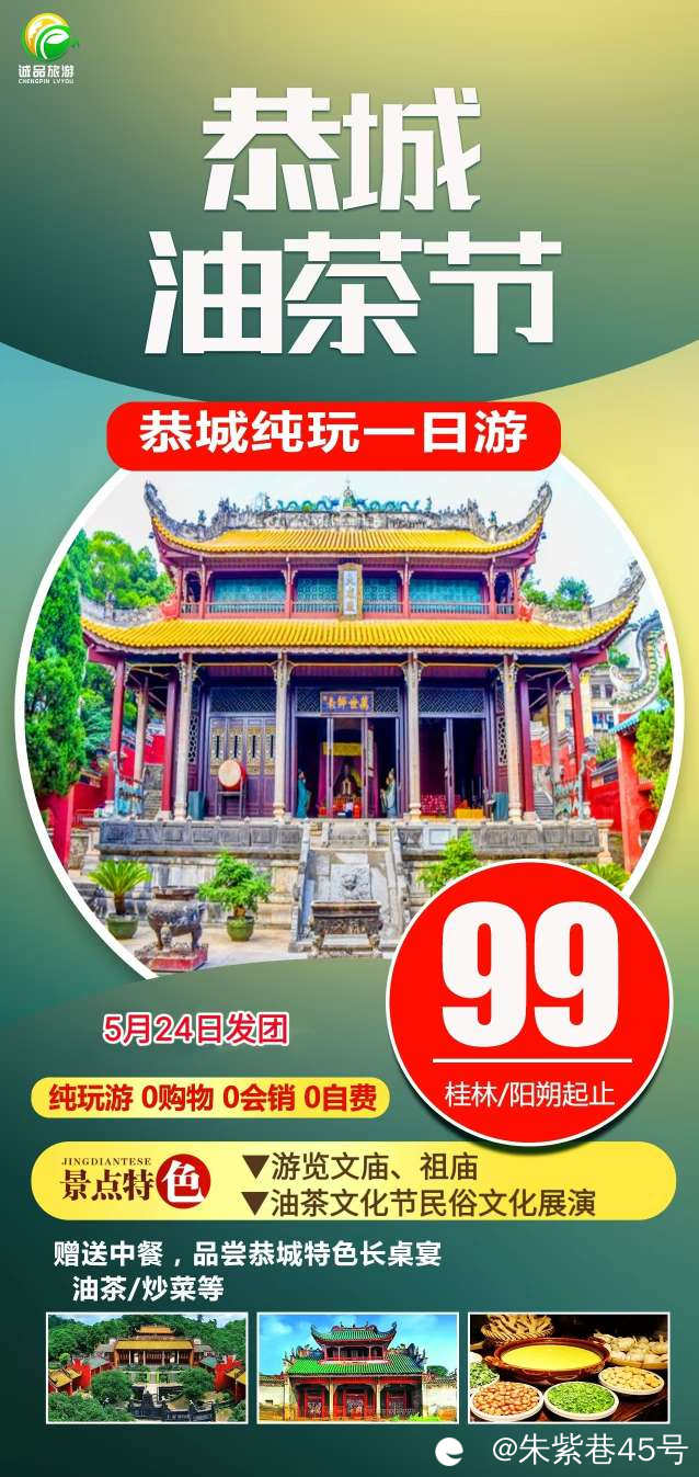 5月24日(周六)恭城油茶节-恭城文庙武庙一日游早上指定时间地点集合 ,早上桂林/阳朔出发,前往魅力恭城县(约 2.5 小 时),将在油茶小镇文化广场举行第十五届“桂林经典·恭城油茶”文化活动周启动仪式,现场将有民俗文化歌舞展演活动。参观广西现存规模最大、历史最悠久、气势最宏伟、保存最完整的庙宇— 文庙、武庙(左为文庙,右为武庙),有“华南小曲埠”之称。它始 建于明朝永乐八年(公元 1410 年),至今已有近六百年的历史。 中午文武庙广场享用长桌宴,看特色演出。根据时间结束今天的活动 ,乘坐大巴返回桂林 ,自行回家。费用:99元/人含:1、交通 :旅游空调巴士 ,车型根据参团游客人数而定 ,保证每人一正座;2、门票 :行程内所含景点首道门票;3、午餐 :长桌宴;4、服务 :国证中文导游服务;5、保险 :旅行社责任险 ,旅游意外险;6、购物 :纯玩无购物无