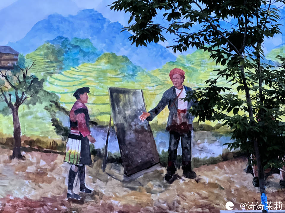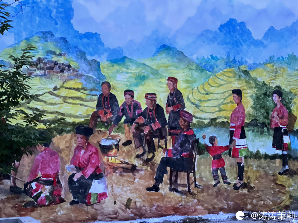 步道边墙体上有很多彩绘,从画里能看出来泗水梯田多,还是红瑶的聚居地区。