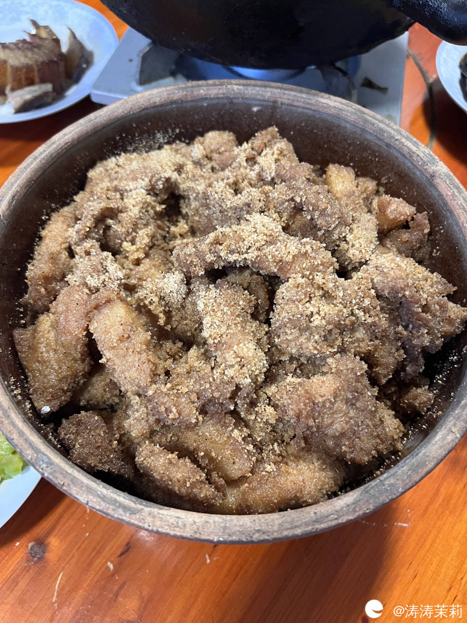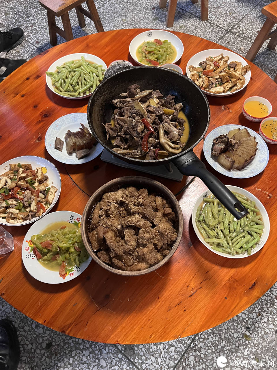 表舅和舅娘做了一桌子菜,特别是表舅听说我要来,特意给我做了粉蒸肉!因为我从小爱吃肉在亲朋好友圈里出了名,他说搬新房子以后我是第一次来,要搬出压箱底的土钵来做粉蒸肉!