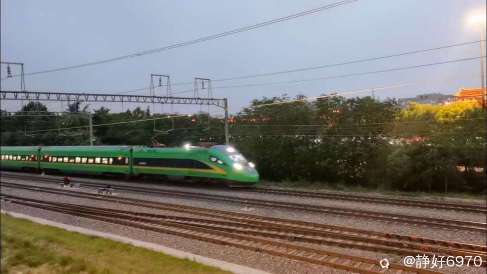 绿色是CR200J复兴号电力动车组,它的出现好像青蛇出没。身上的银光闪烁,犹如一条青龙飞逝而过。