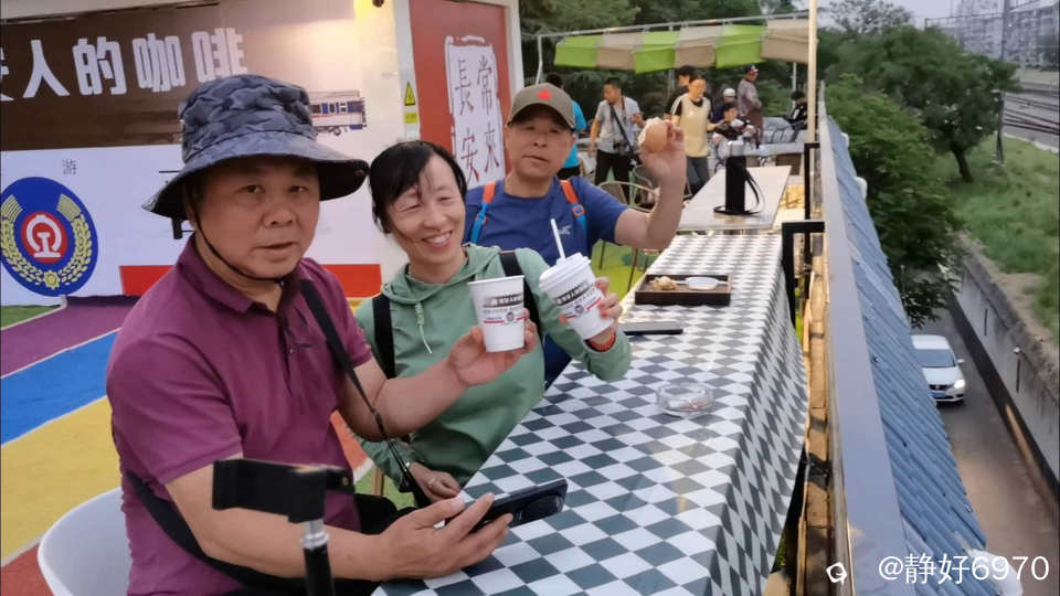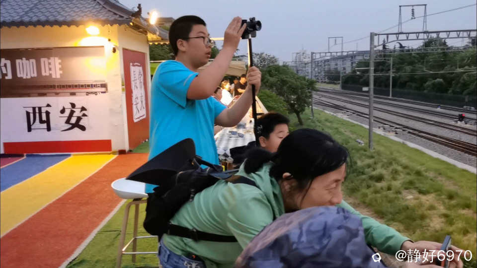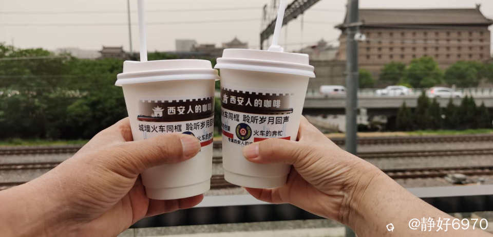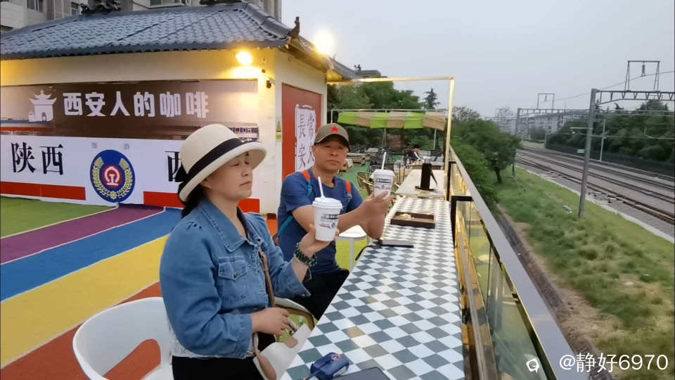 走了一圈差不多2万步,同学看出我们的心思,说,“等会我带你们去个好地方,那里不仅能坐下来喝茶聊天还能看火车,看你们个个这么累了,休息一下。”于是来到了“西安人咖啡”,一到这里就被这里的环境所吸引,于是买了两杯咖啡来到屋顶的大平台,由于天还没黑,对面的城楼还没有亮灯,我们可以边喝边等,等着火车和城墙同框。