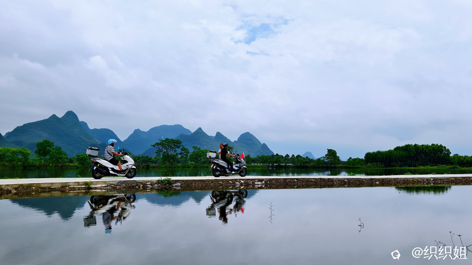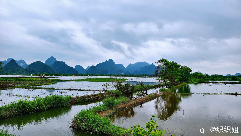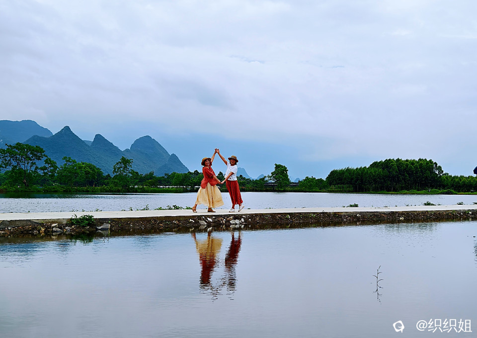 雨过天晴,塘北村的农田里蓄满了雨水。田水如镜,映着桂林特有的山峦,映着天空中的流云。农耕路如飘带飘落在田野里,人们站在飘带上,似持练的舞者,映在水里与大自然的山峦,天空,树林融为一体,似梦如幻。