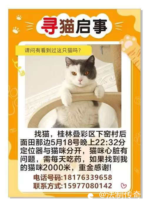 寻猫启事请问有看到过这只猫吗?找猫,桂林叠彩区下窑村后面田那边5月18号晚上22:32分定位器与猫咪分开,猫咪心脏有问题,需每天吃药,如果找到我的猫咪2000米,重金感谢!电话号码:18176339658联系方式:15977080142