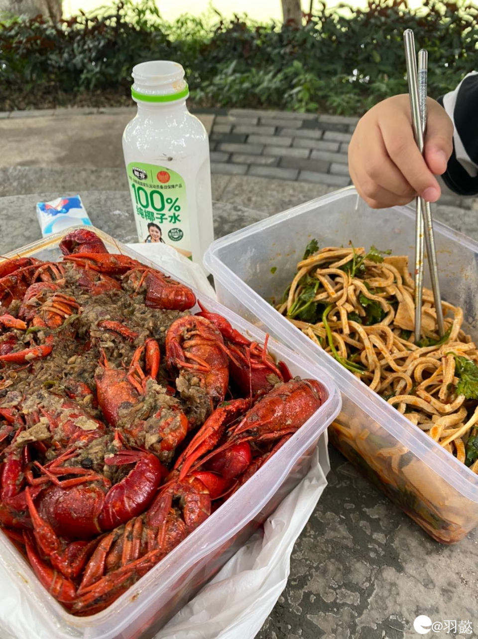 带着做好的小龙虾和凉拌千张