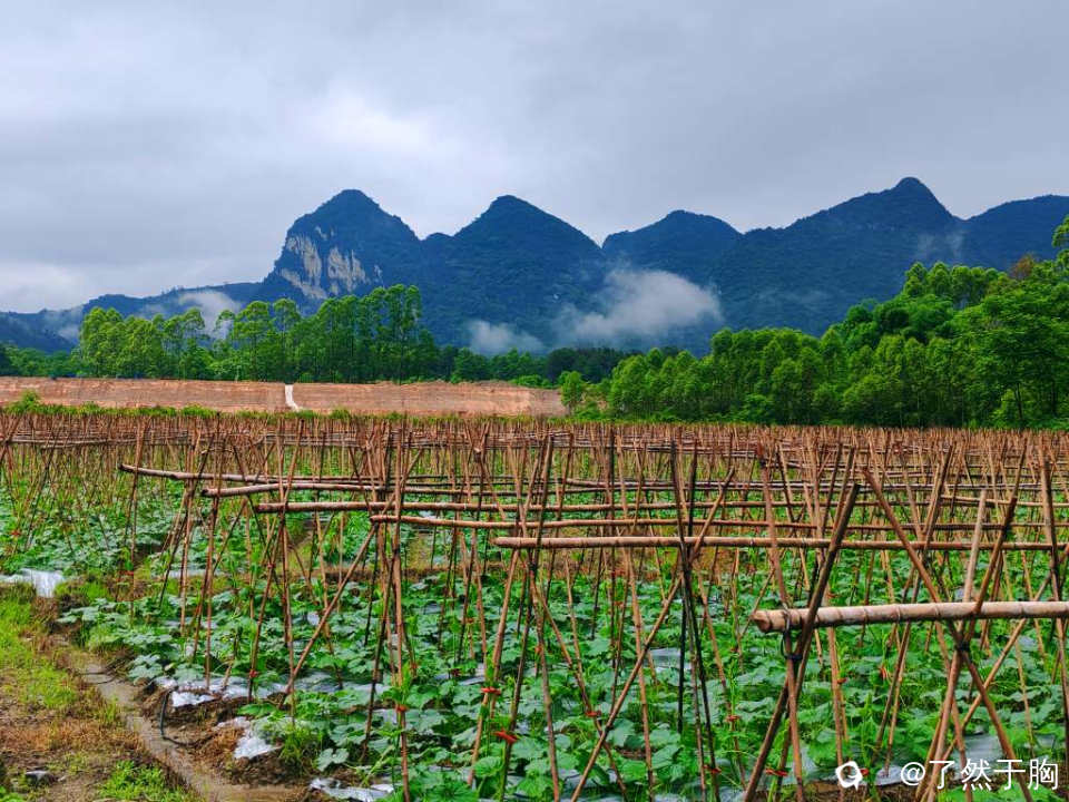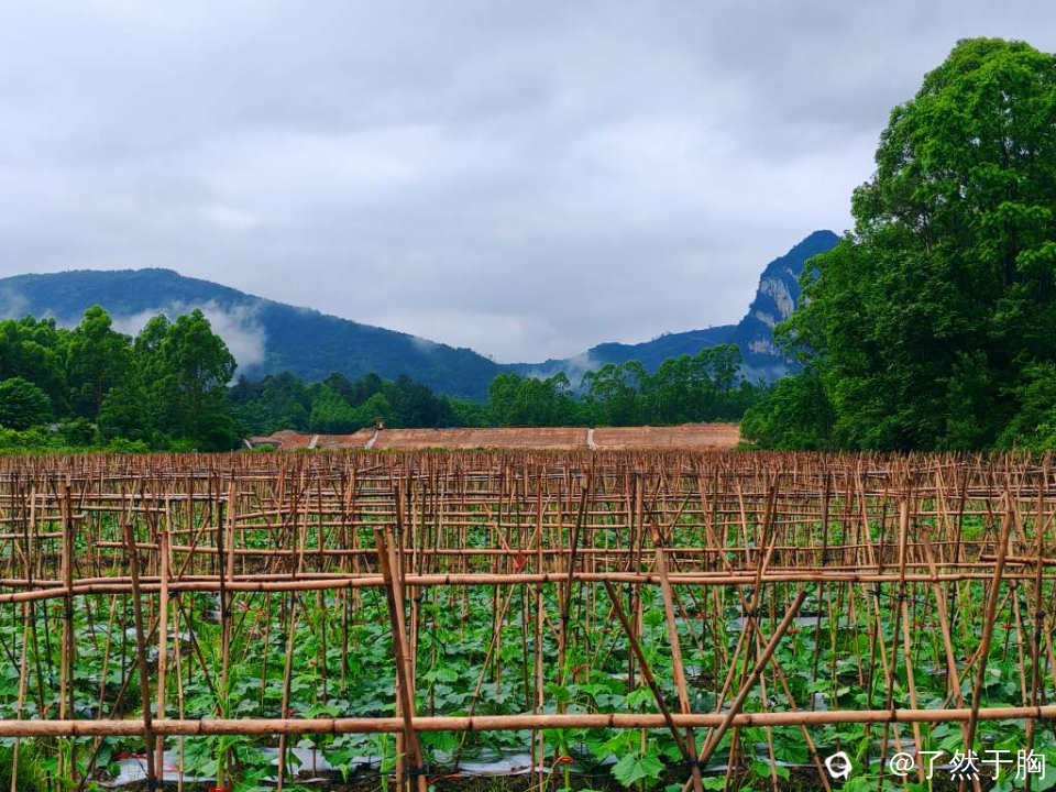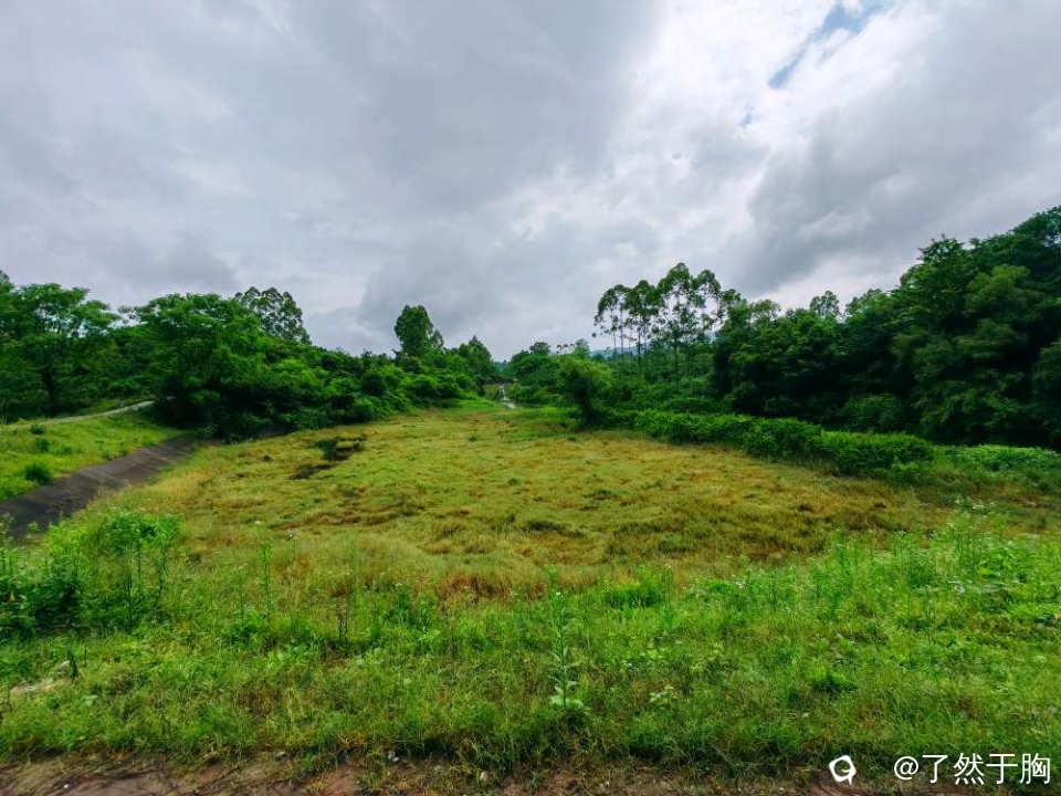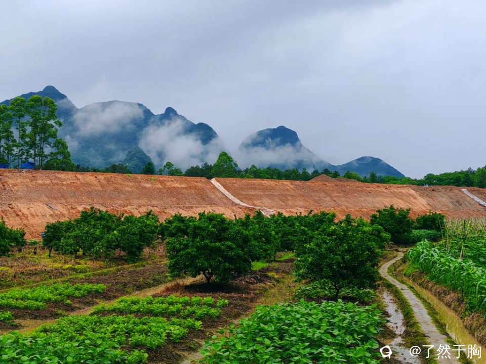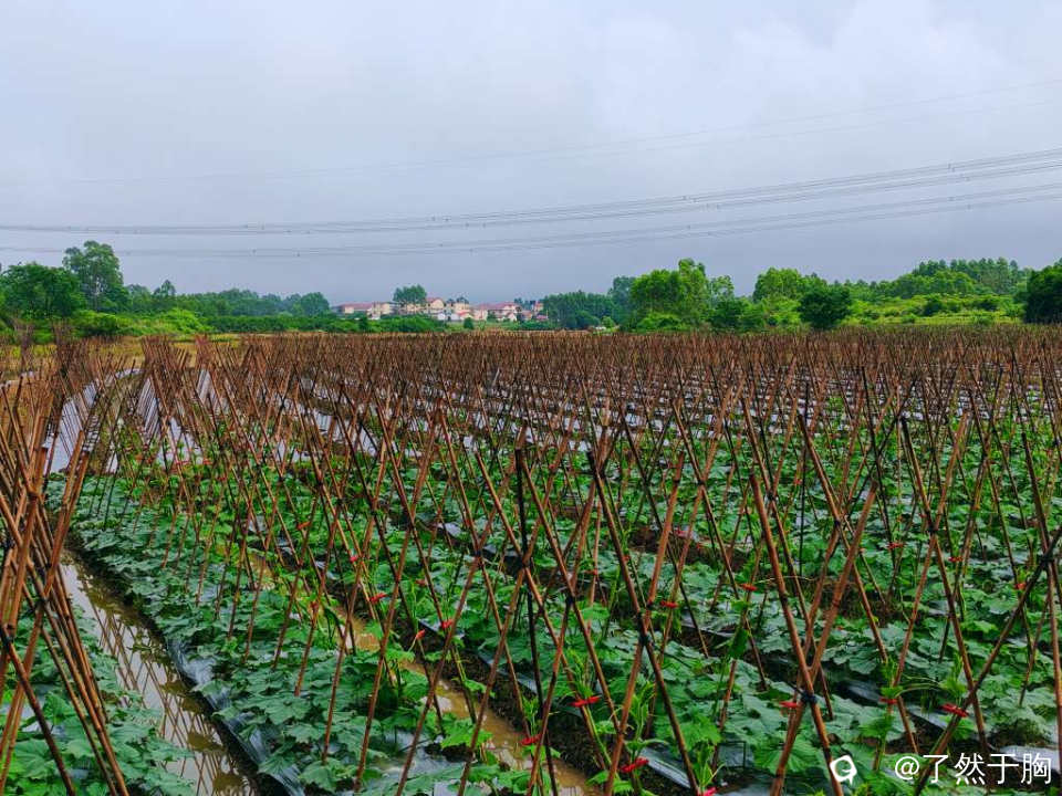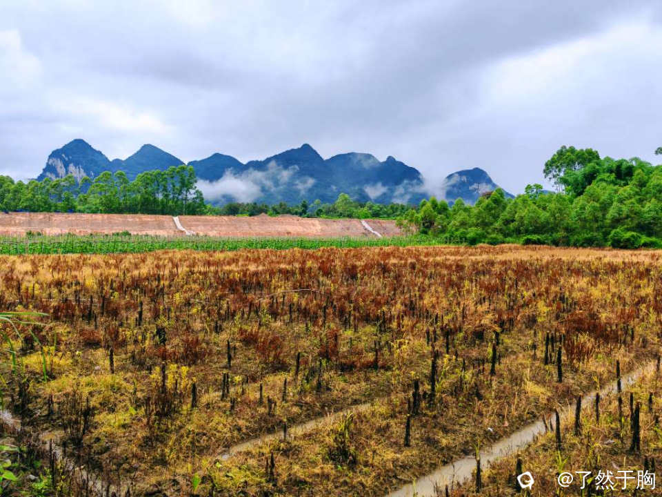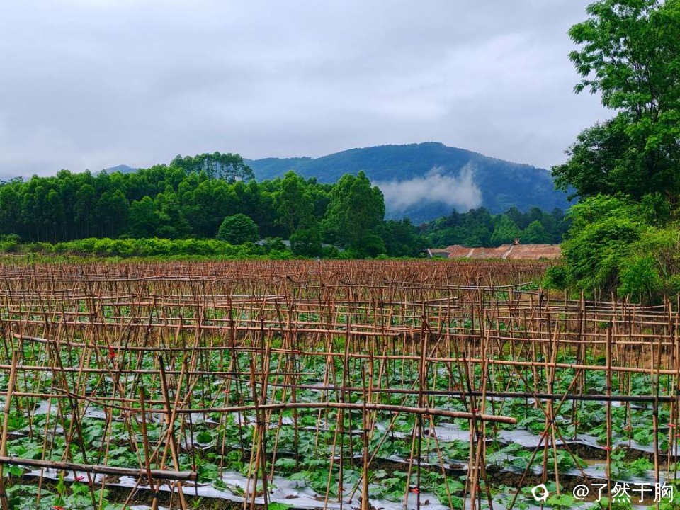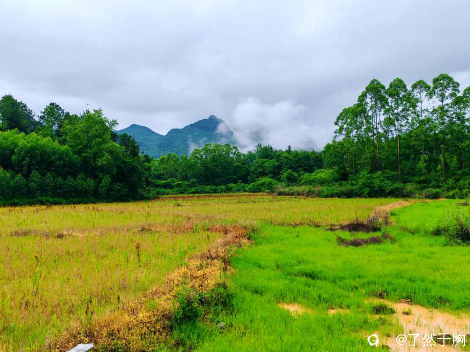 因为阵雨不停,所以只能沿已是水泥浇注的机耕道漫行。走在田垌间,环顾四周,但见远处山峰之上山岚浮动,近处山岭树木葱笼,眼前田间色彩斑斓。有碧绿的经济作物冬瓜园,大豆田,玉米地等;有绿茵茵的成片的野草,有枯草成片的丢荒田地等,不一而足,景色美不胜收。