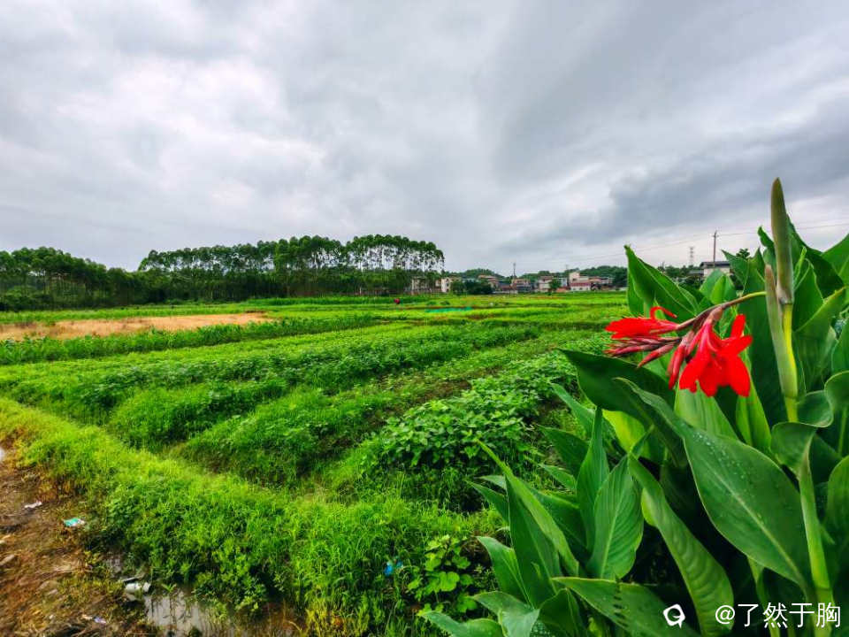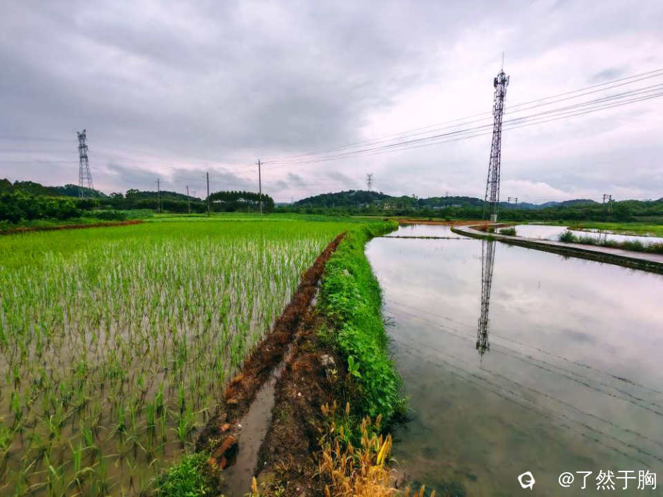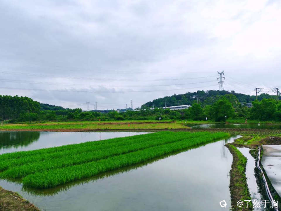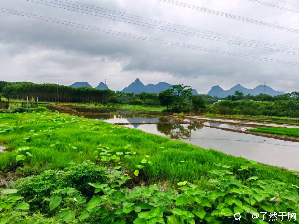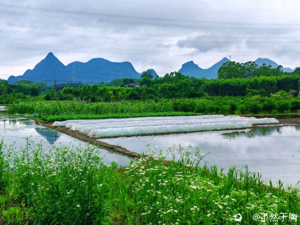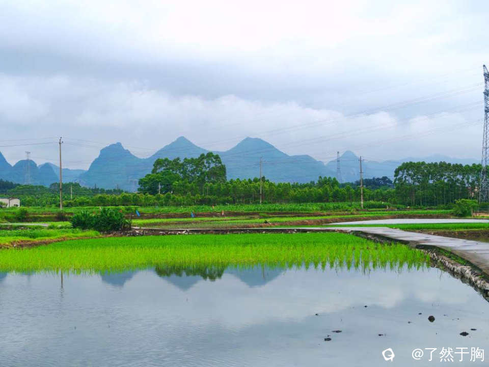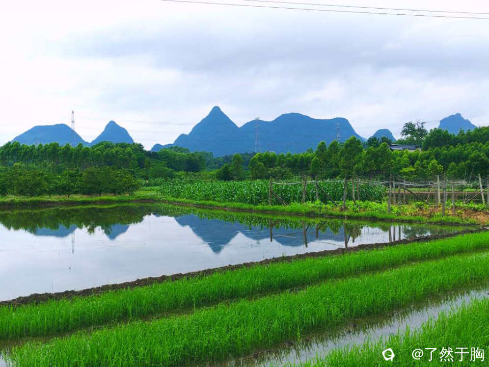 初夏时节,田野平畴之中,既有绿茵茵的秧苗,排列整齐划一的稻田。还有各种各样的经济作物,各色各样的花儿夹杂在田间地头。那已经犁耙过尚未种植的水田,犹如一块块铮亮的镜子,倒映着远处连绵起伏的群山,如诗如画。