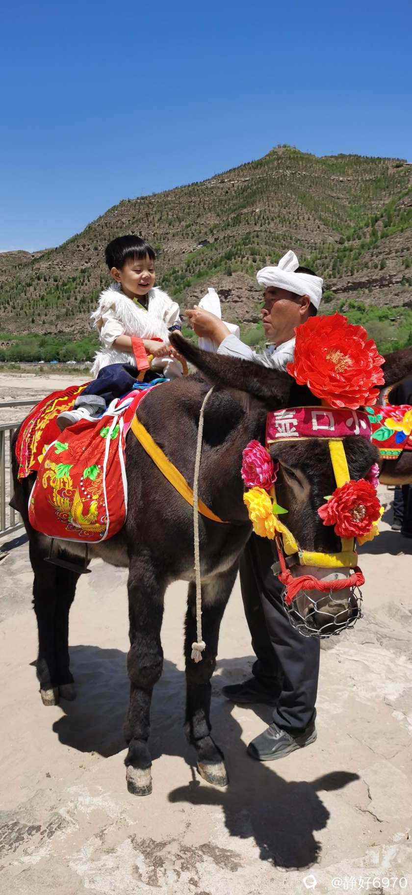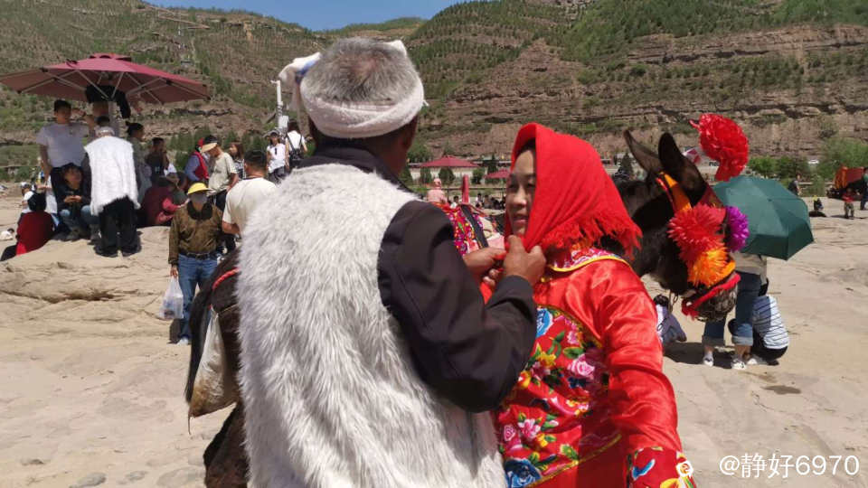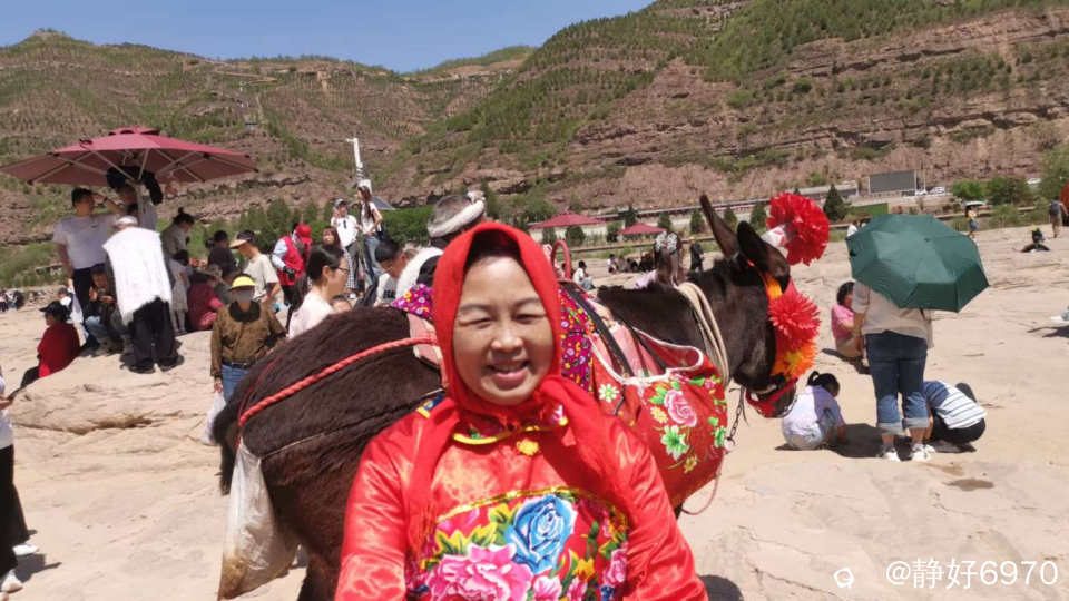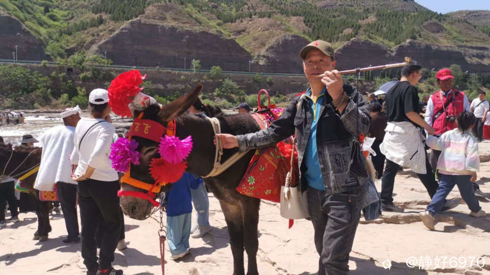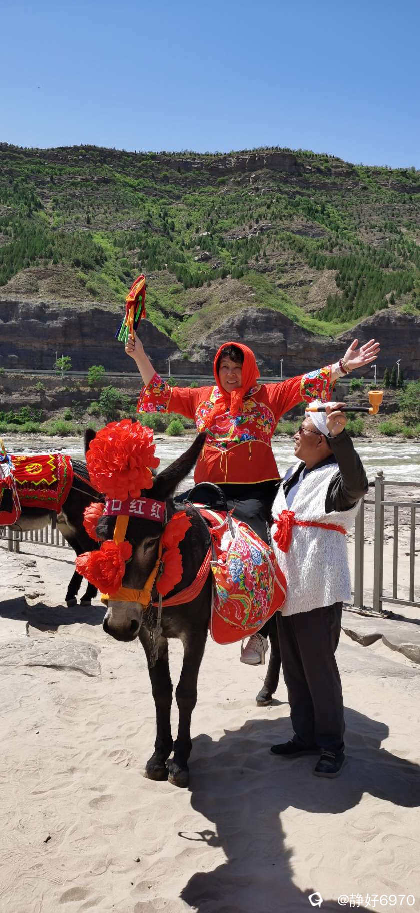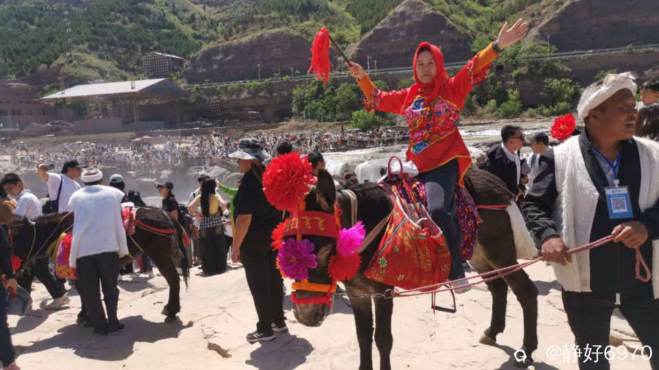 既然来到陕西,不仅要看壶口瀑布,还要体会一下陕北民族的浪漫。古有张果老倒骑毛驴,我这次来正骑毛驴,红围巾披头上,大红花袄一穿,顿时变了一个人,把我笑的眼睛变成一条缝,我家先生也想应景摆个POS,于是叼着一根长长的铜烟杆,可惜没有把白色的头巾扎上,白色的马褂穿上,不然就是妥妥滴陕北汉子啦……