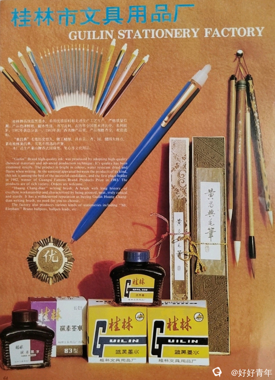 到了80年代,改革开放的春风吹遍了大地,桂林文具用品厂也跟着热闹起来。为了迎合市场的需求,除了老本行毛笔,还生产出桂林牌高级墨水、书法墨汁,还有圆珠笔、胶水、彩色笔等,产品畅销全国各地。值得一提的是,1982年的桂林牌高级蓝黑墨水拿下了全国评比第一名,被轻工部评为A级产品,那可是相当风光!