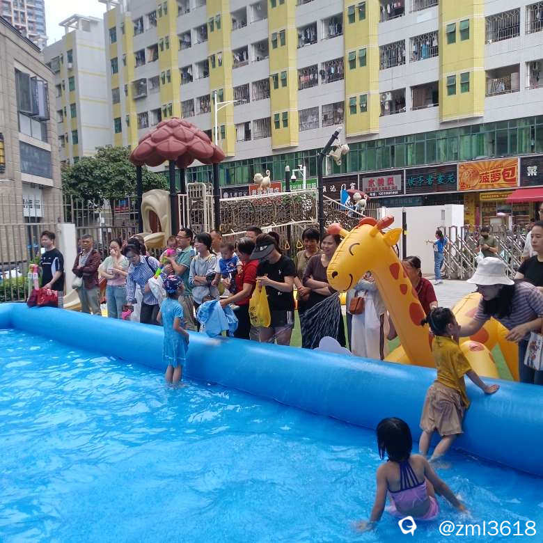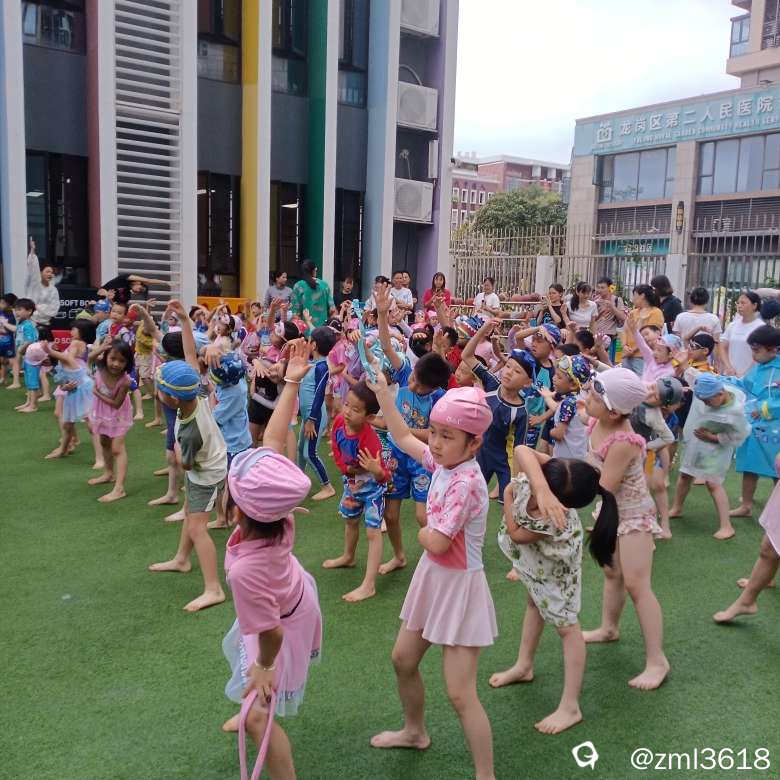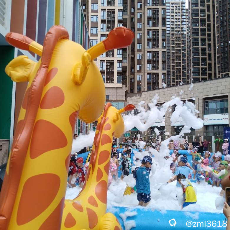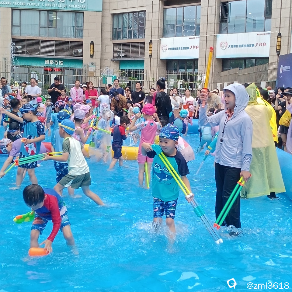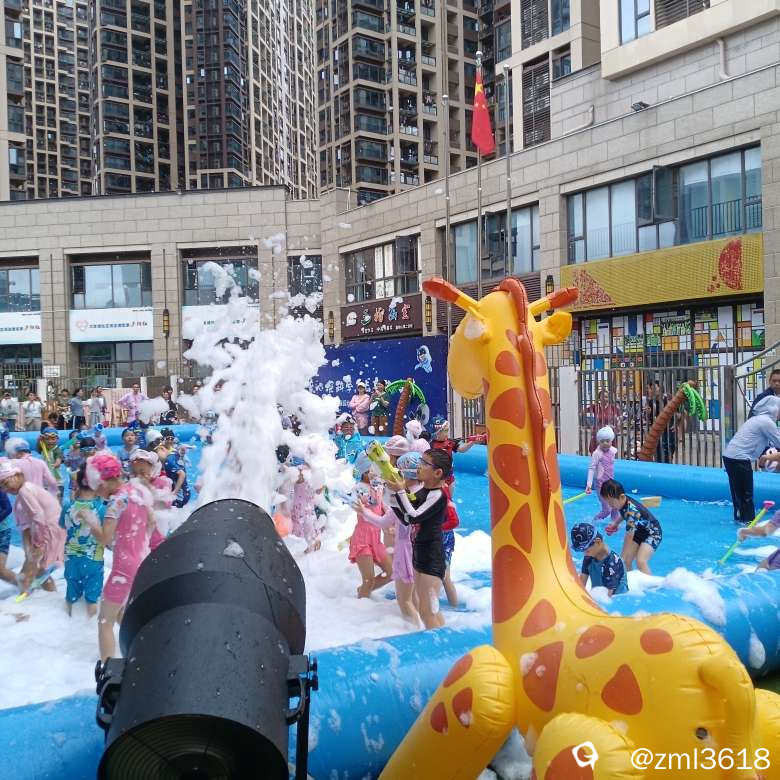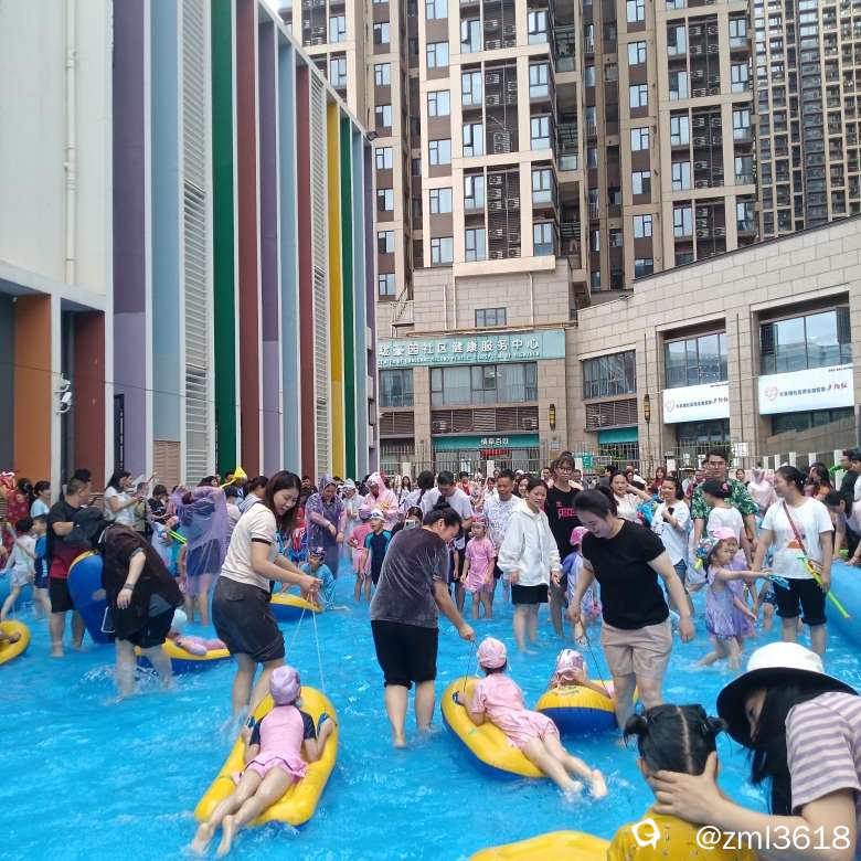 早上9点半,幼儿园早已布置了喜庆的水上充气水池,音乐声震耳欲聋。孩子们的家长也挤满了水池边,有的还带了照相机,为娃儿们加油。