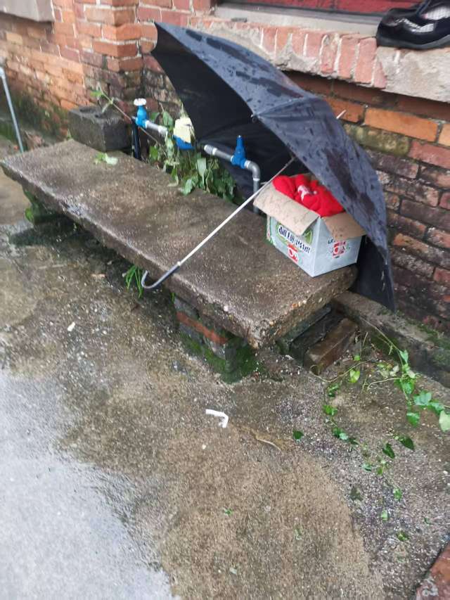 由于雨一直下,附近也没有遮风挡雨的地方,只好返回去又拿了一把雨伞给纸盒支撑着