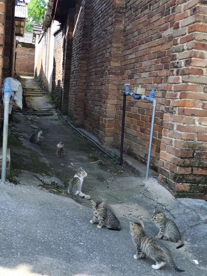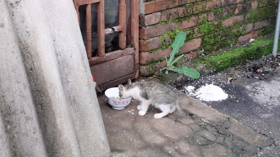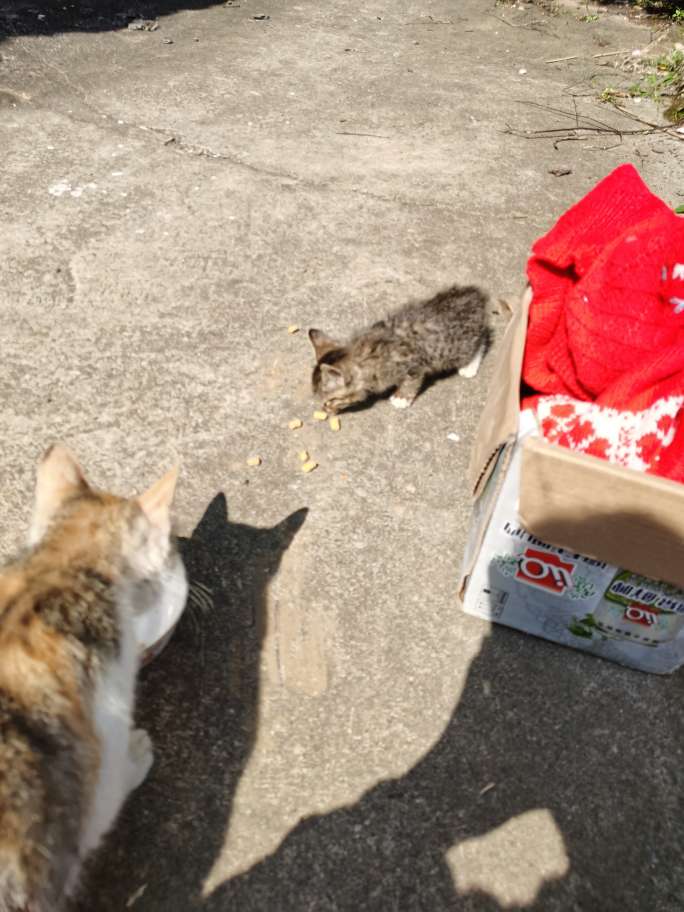 几个小时过去了,我又想去看看那只奄奄一息的猫猫是否还活着?这时见猫妈妈带着其他的孩子来到一间铁门锁着,木门半掩着的房子里,邻居也把纸盒子挪到这房子门口,让小小猫能听见同伴的呼唤。这时我唯一能做的又是给猫猫们提供猫粮。并顺便找来一块石棉瓦把纸盒挡住,避免被雨水淋湿。