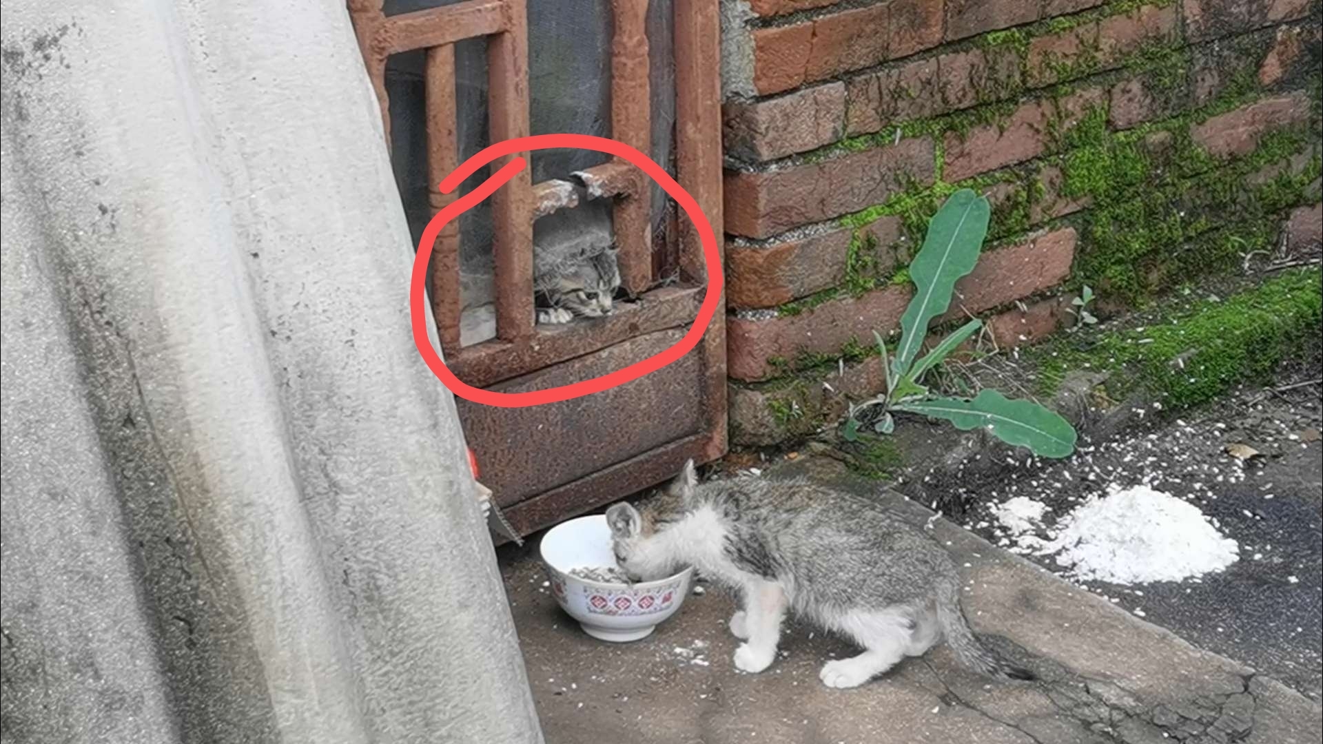 不看不知道,一看吓一跳,只见那只快要去喵星的猫猫腾空而起,嗖的一下钻进铁门里。这时我又给小小猫准备了一碗猫粮,静等着它的出现。
