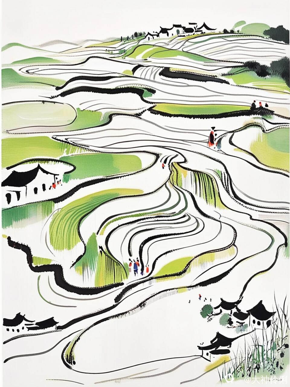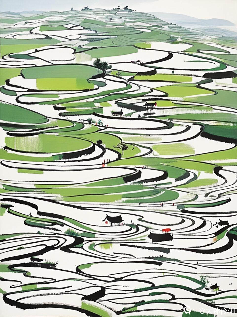 好在现在有了AI,我就把吴冠中江南水乡的风格和龙胜梯田的风景结合起来 ,生成了下面的画作,给大家欣赏,不知大家感觉如何?
