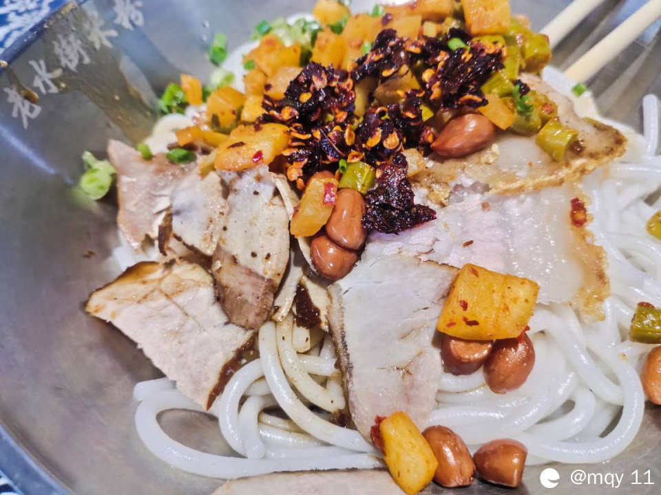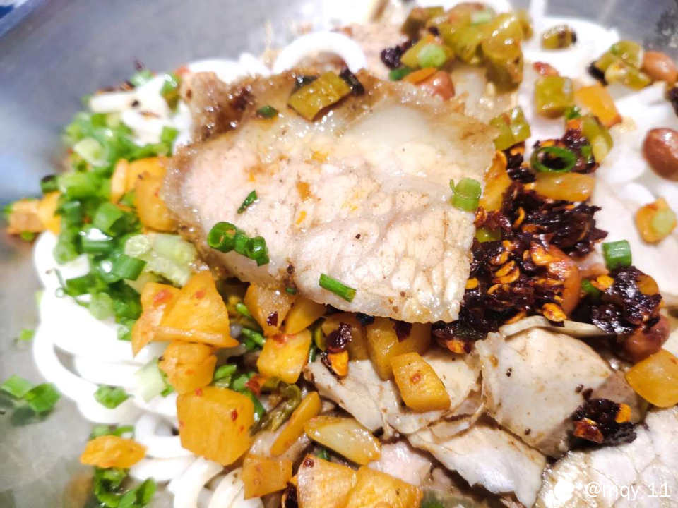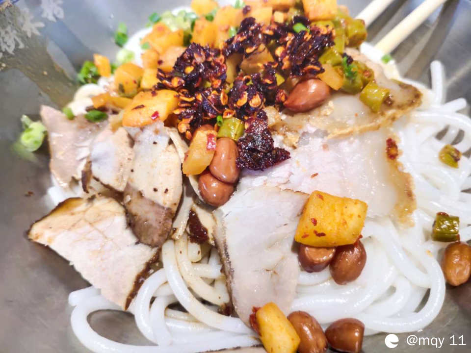 脆香酥脆的锅烧,过过香油的辣椒粉,微微咸香的卤水,搭上爽口的酸豆角,酸笋,成就了这碗受大众欢迎的米粉。