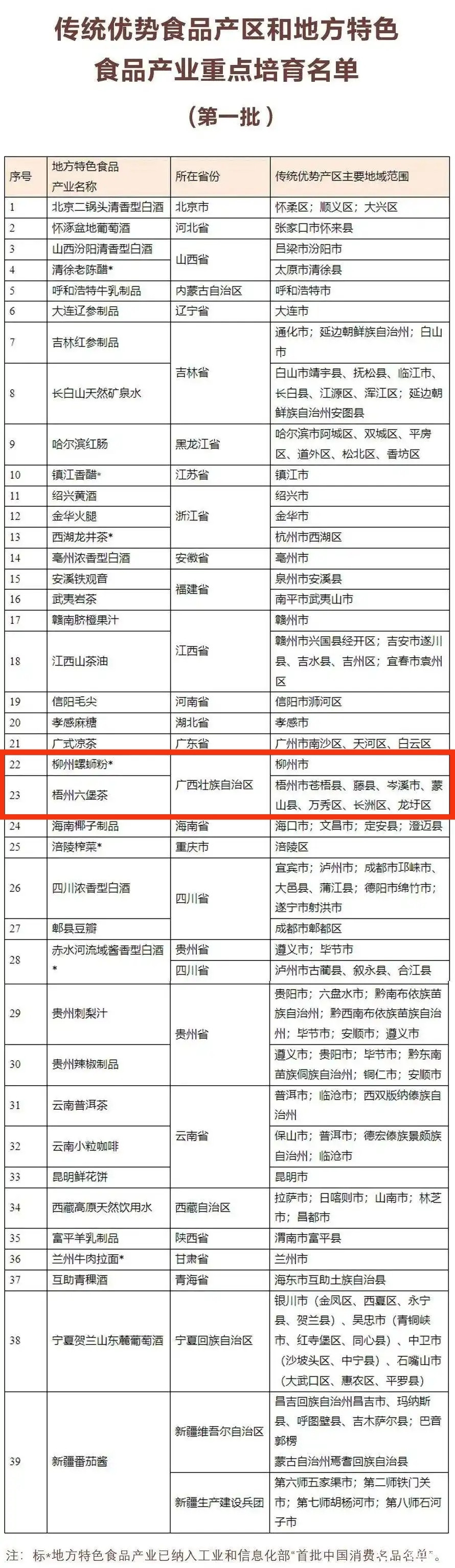 近日工信部公布全国第一批39种地方特色食品产业名单,广西2种食品柳州螺蛳粉梧州六堡茶上榜