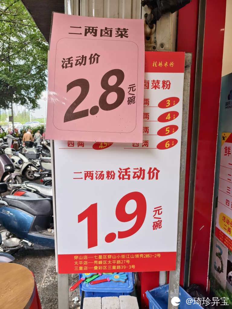 桂林米粉,放到全国来说,也算极其物美价廉了吧,五六块钱二两还有肉,小料随便加,这在别的城市根本不敢想,我觉得已经非常非常实惠了。没想到最近居然卷出了新高度,1.9元二两汤菜粉,肉给的还不少,这价格妥妥的回到了20年前呀,现在的商家都这么拼了吗?