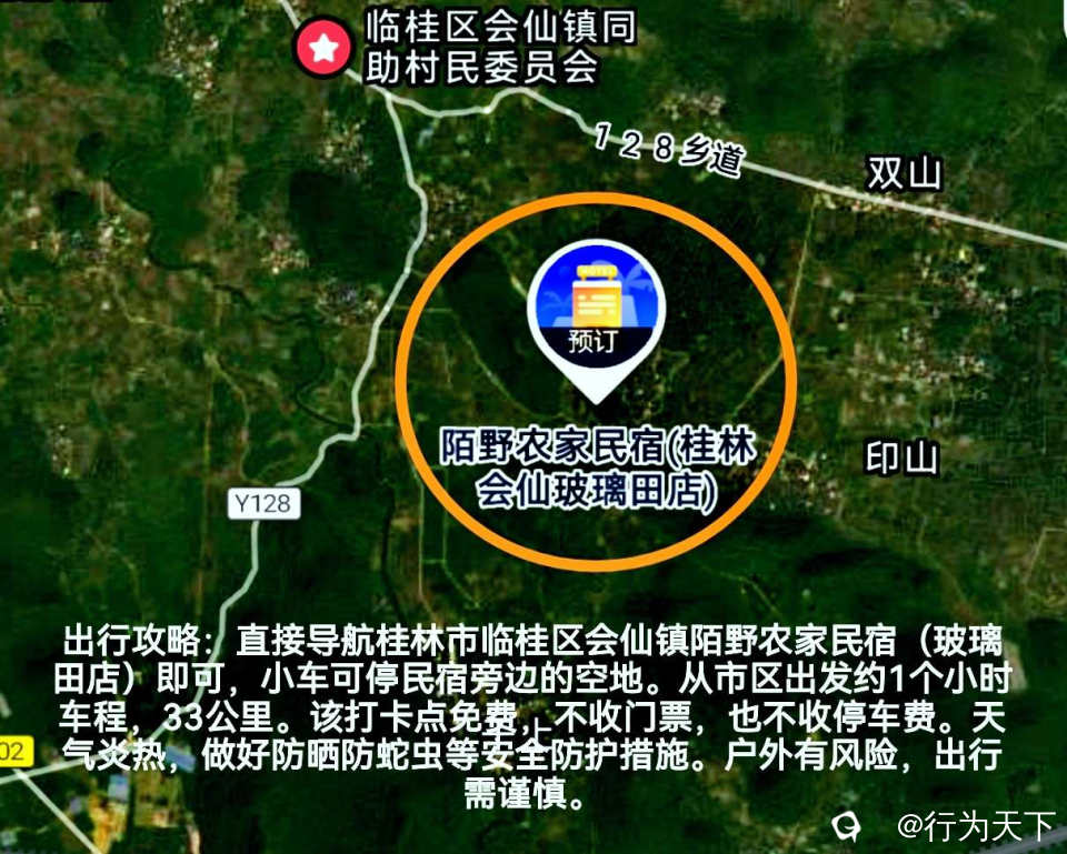 出行攻略:直接导航桂林市临桂区会仙镇陌野农家民宿(玻璃田店)即可,小车可停民宿旁边的空地。从市区出发约1个小时车程,33公里。该打卡点免费,不收门票,也不收停车费。