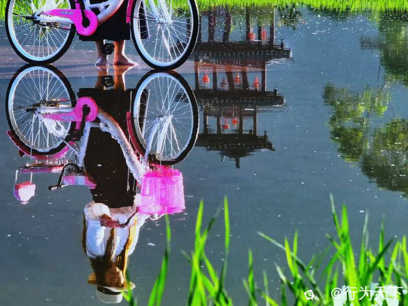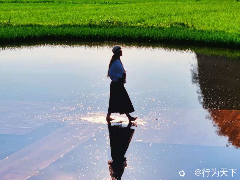 夏日的稻田绿浪翻滚,镜面平台将天空、山峦与秧苗无缝衔接,仿佛天地在此交融。游客驻足镜面,裙摆飞扬间,身影与白云、青山共舞,人之静,随影而动,绚烂的光影效果随手一拍即成大片。