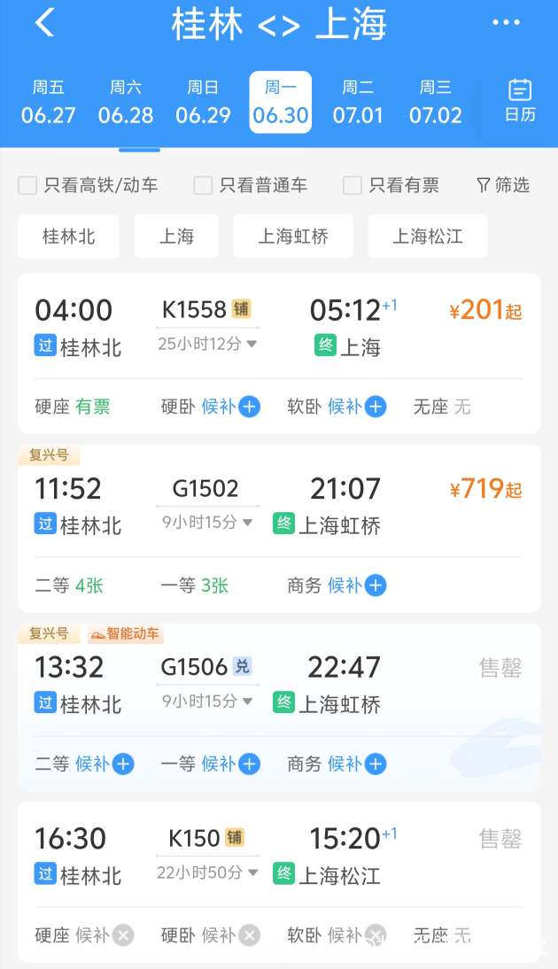 但12306网上桂林一上海自6月30日起,及7月1,2日原有的6趟车只有4趟。看来,新型车辆尚未到位。升级的车次价格,时间均不知。不过,提价应该是肯定的了。