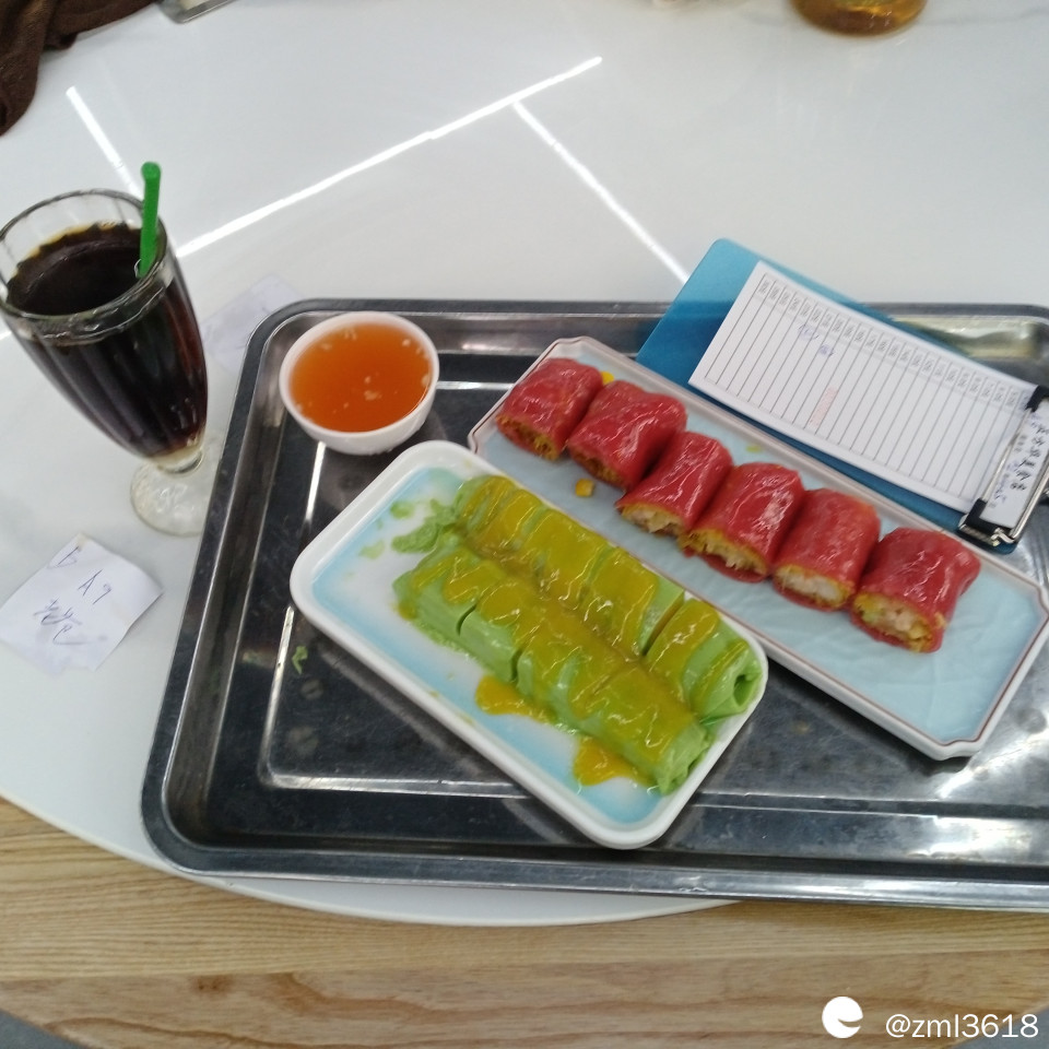 咱排队要了一份正方华的招牌茶点:红米肠。想尝尝海口老爸茶的红米肠和其它地方早茶的红米肠有何不同。服务员还向我推荐了一份斑斓芒果肠。