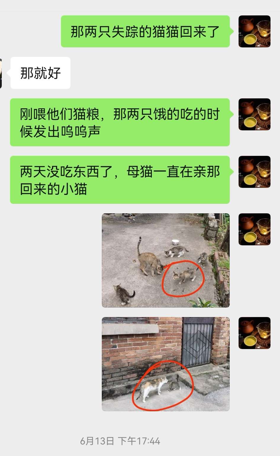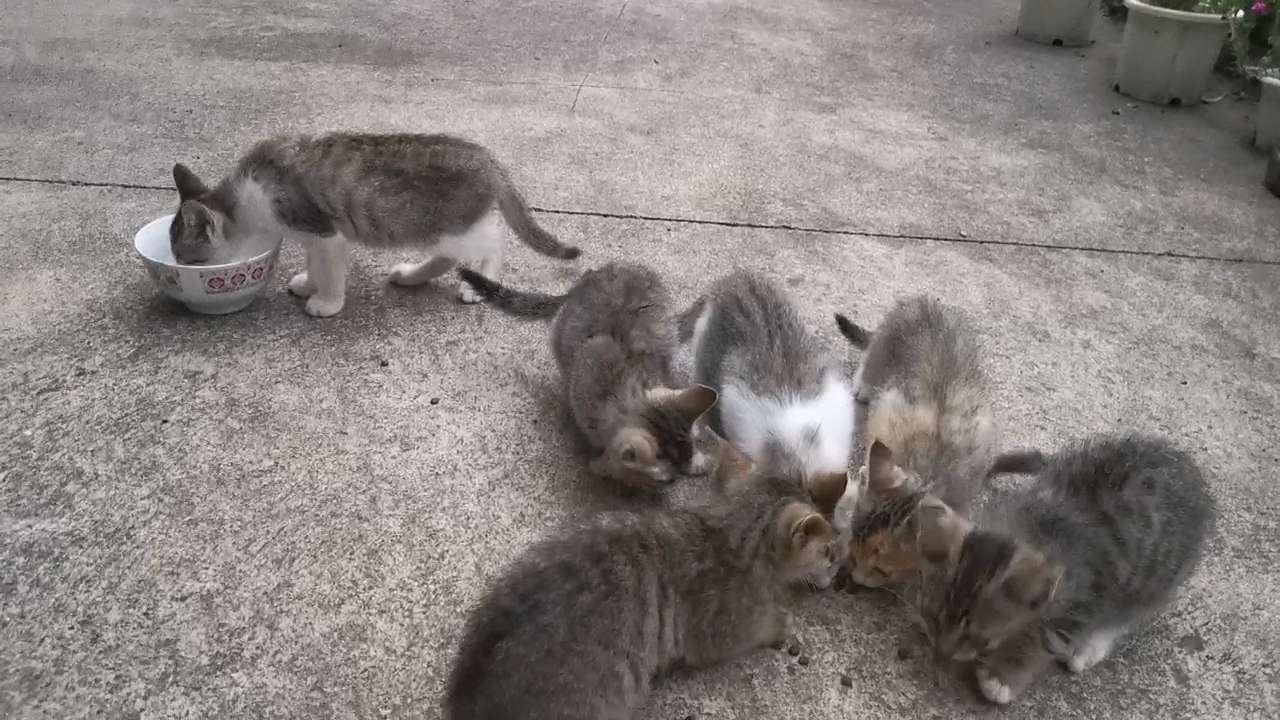 猫妈妈见它们俩回来了也很开心,不停地给小小猫舔毛,我画圈的那两只就是失踪两天回来的小小猫。这时我赶紧拿出所剩不多的猫粮去喂它们,想不到它们狼吞虎咽还发出呜呜声,好像在说好好吃,好美味!