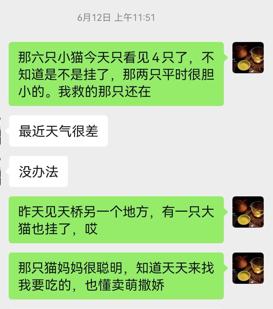 6月12日投喂时,6只小小猫只出现4只,有两只突然不见了。我的心情也跟着不好了。特别是出去买菜时,又见拐弯路口死了一只大猫。心情就跟这雨天一样,顿时感觉郁闷和失落,连空气都染上了灰色调。