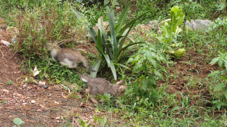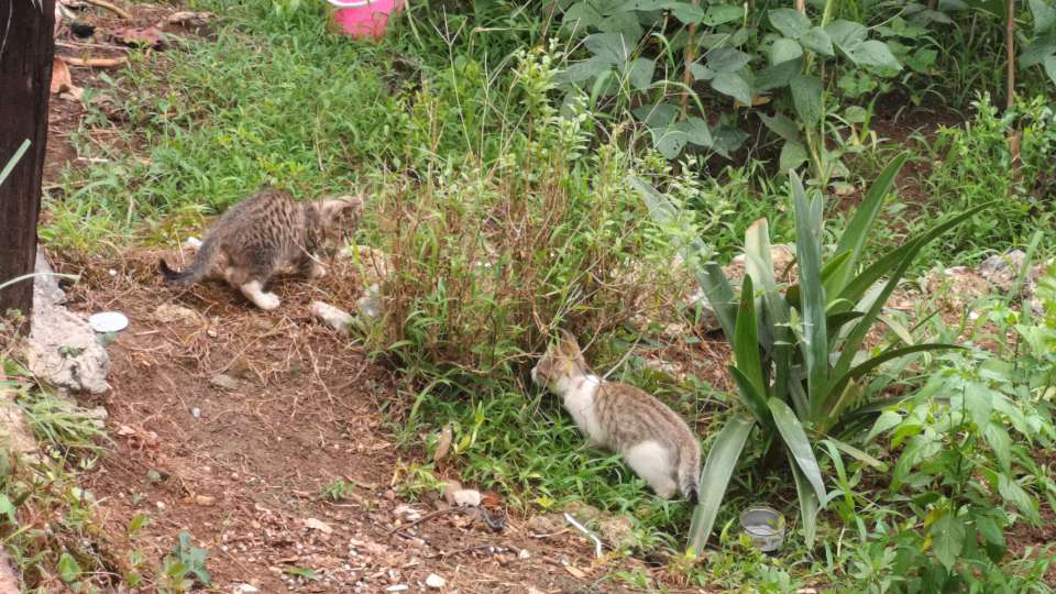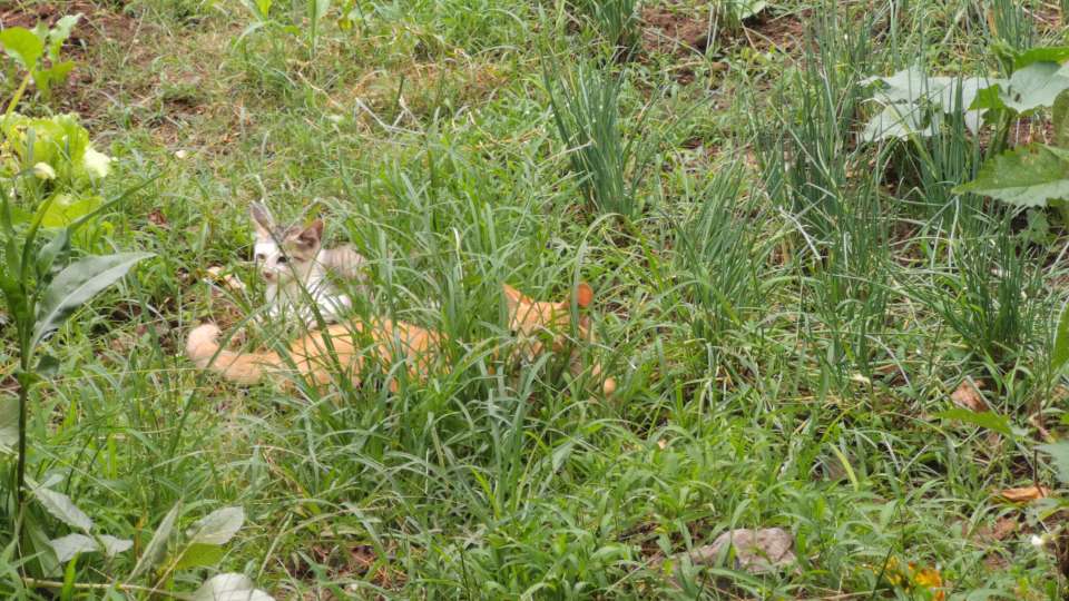 随着时间的流逝,二十多天过去了,小小猫也快乐成大起来。我没事就喜欢看他们晒太阳,嬉闹,在菜地里跑来跑去,去天然猫砂盆刨坑,有时跳到柱子上,有时滚在草地上,有时又跑到屋檐顶上……