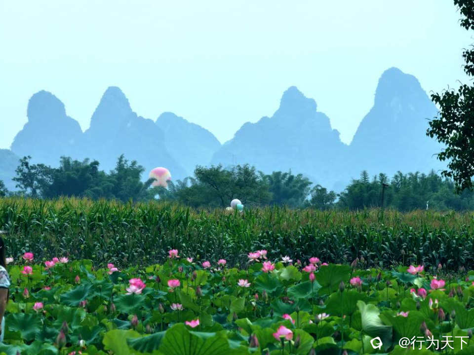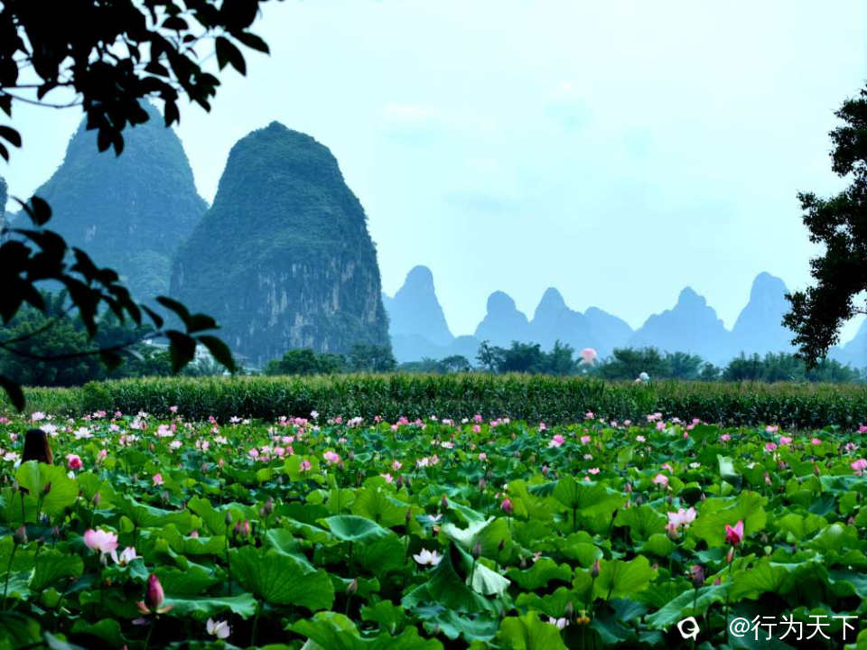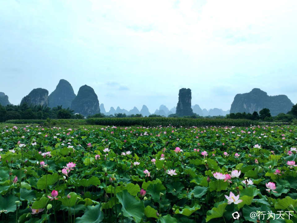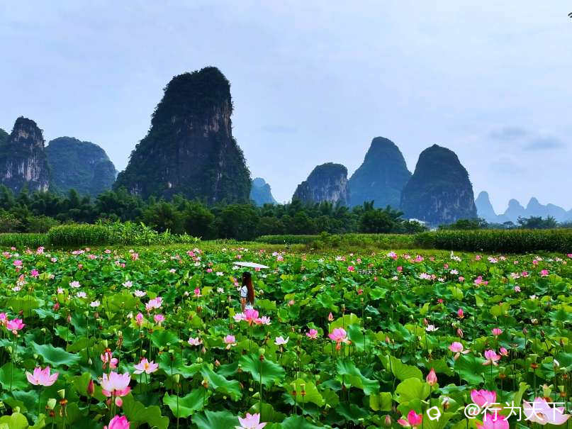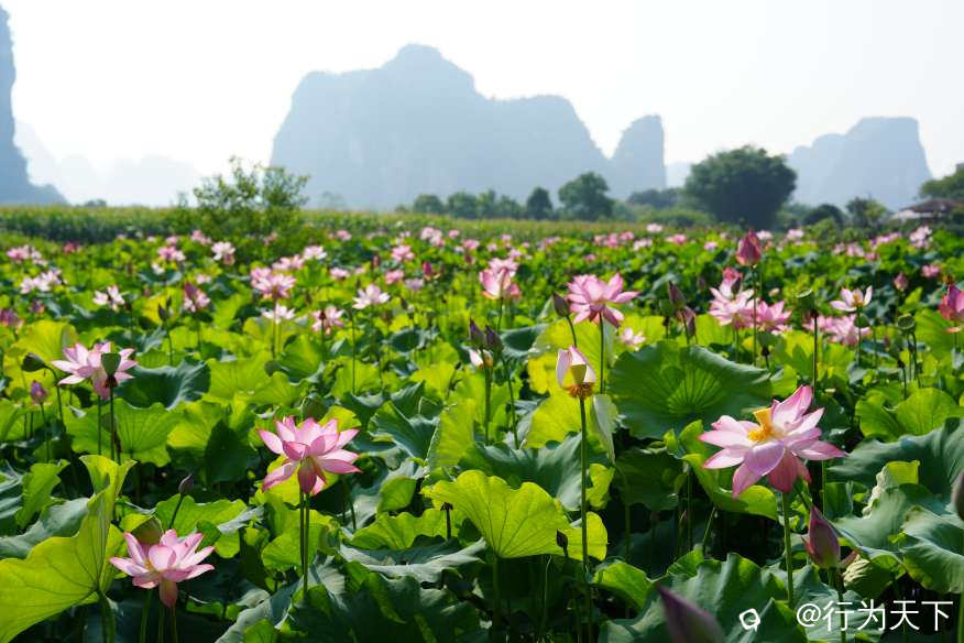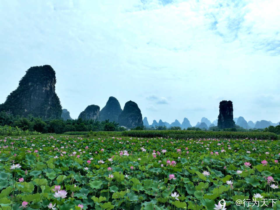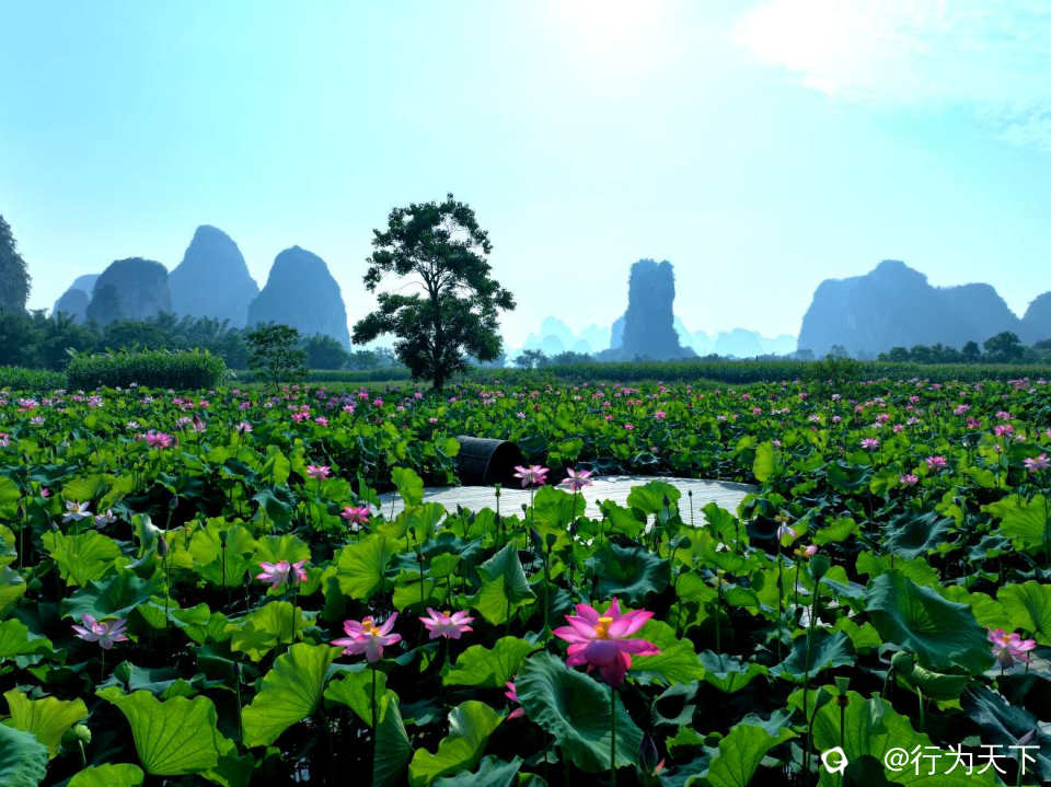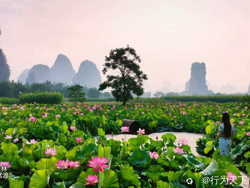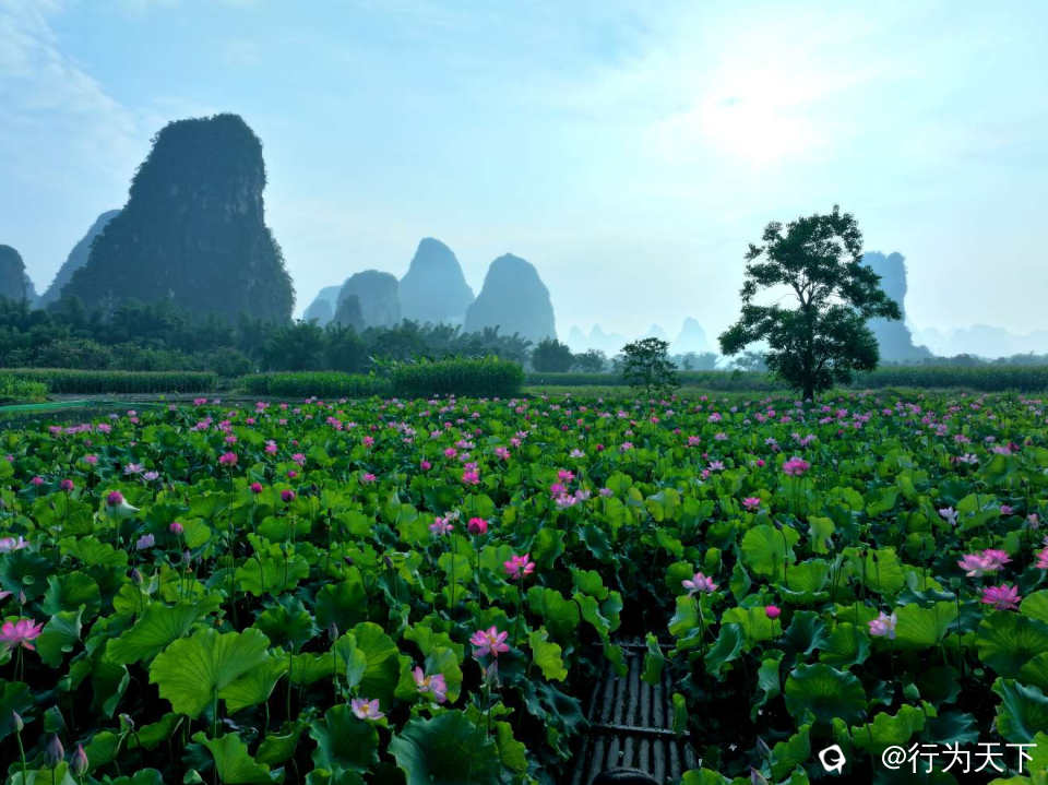在阳朔喀斯特群峰的环抱中,鸡窝渡村的近百亩荷塘正迎来一年中最壮观的时刻。