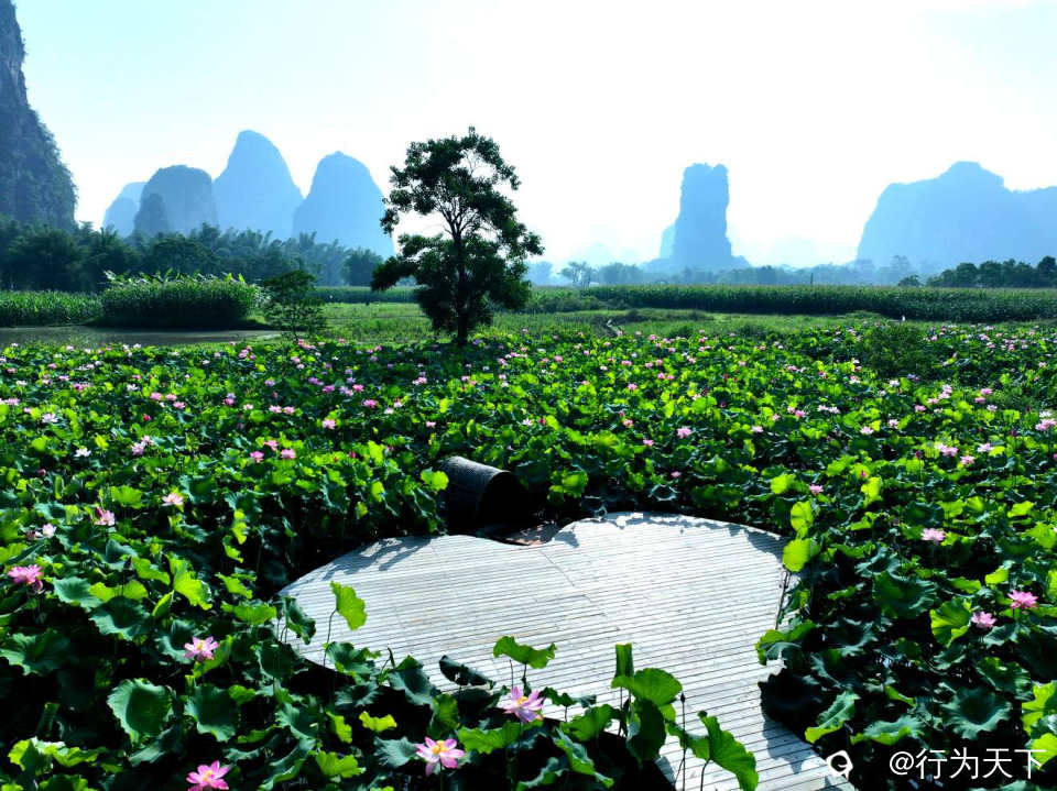 风过时,花浪翻涌,莲香浮动,与远处水墨画般的峰林倒影交融,恍若天地共绘的巨幅画卷。这里的荷花不似江南的婉约,却因山水映衬而显磅礴。