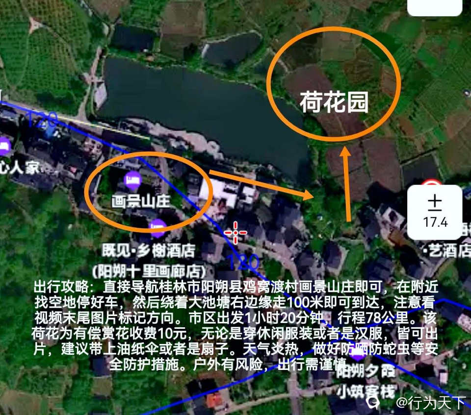 出行攻略:直接导航桂林市阳朔县鸡窝渡村画景山庄即可,在附近找空地停好车,然后绕着大池塘右边缘走100米即可到达荷花园,注意看视频末尾图片标记方向。