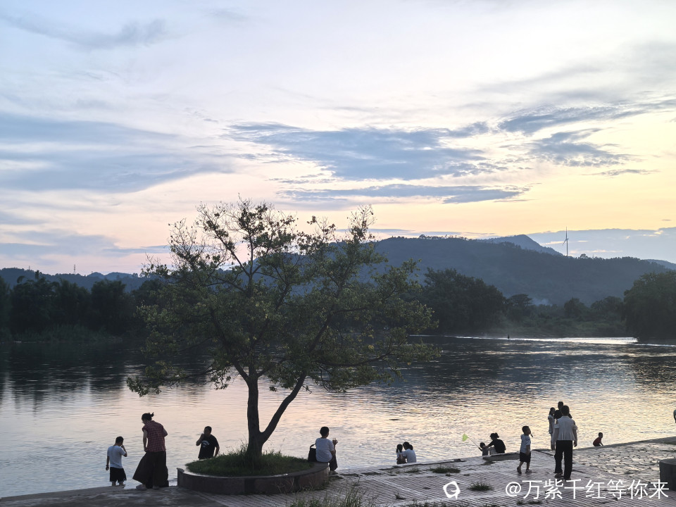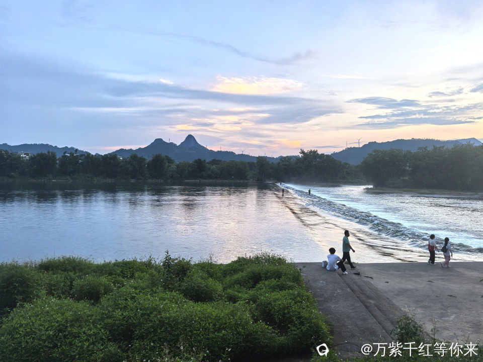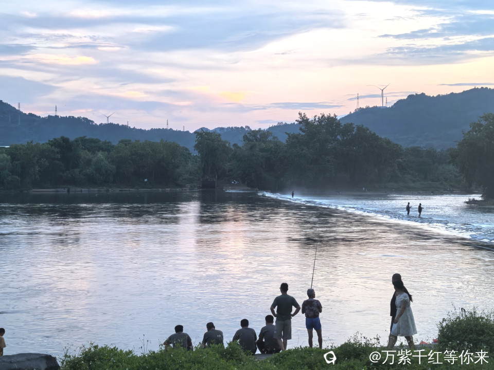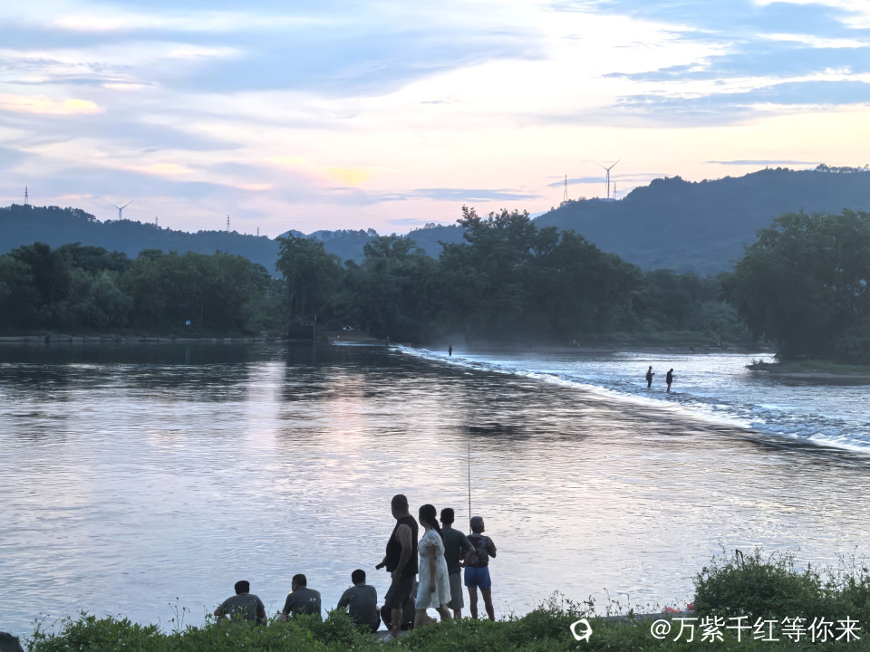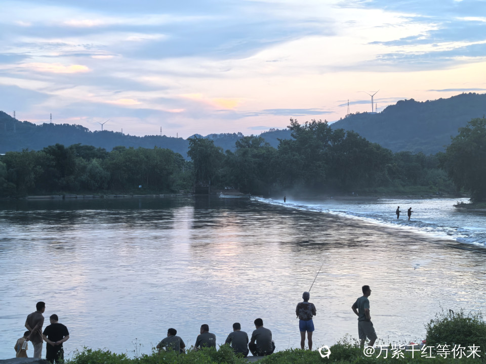 远处的山峦连绵起伏,山顶上的风车静静的矗立在那里,为这宁静的画面增添了灵动。堤岸上散步的人们也成了一道风景,他们或是情侣手挽着手,甜蜜地分享着彼此的快乐;或是一家人其乐融融,孩子在前面嬉笑奔跑,大人们在后面微笑注视着;又或是老人们相互搀扶着,回忆过去的点点滴滴。还有那在河边的垂钓者……,他们的身影与这茶江的傍晚景色相互交融,构成了一幅充满生活气息的美好画卷。