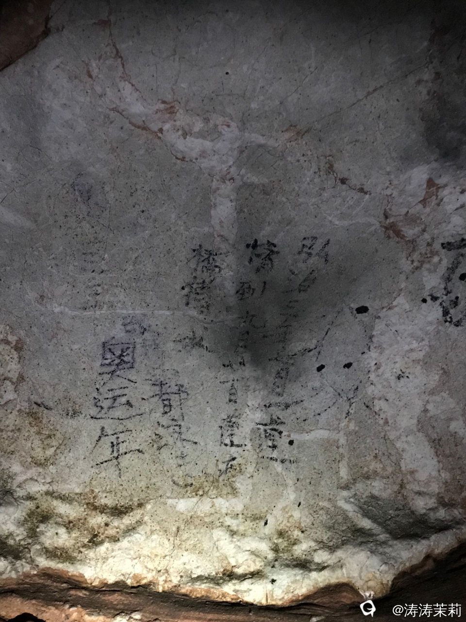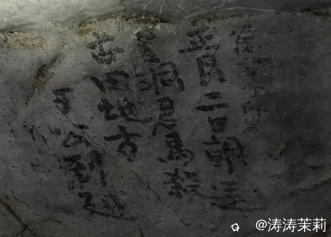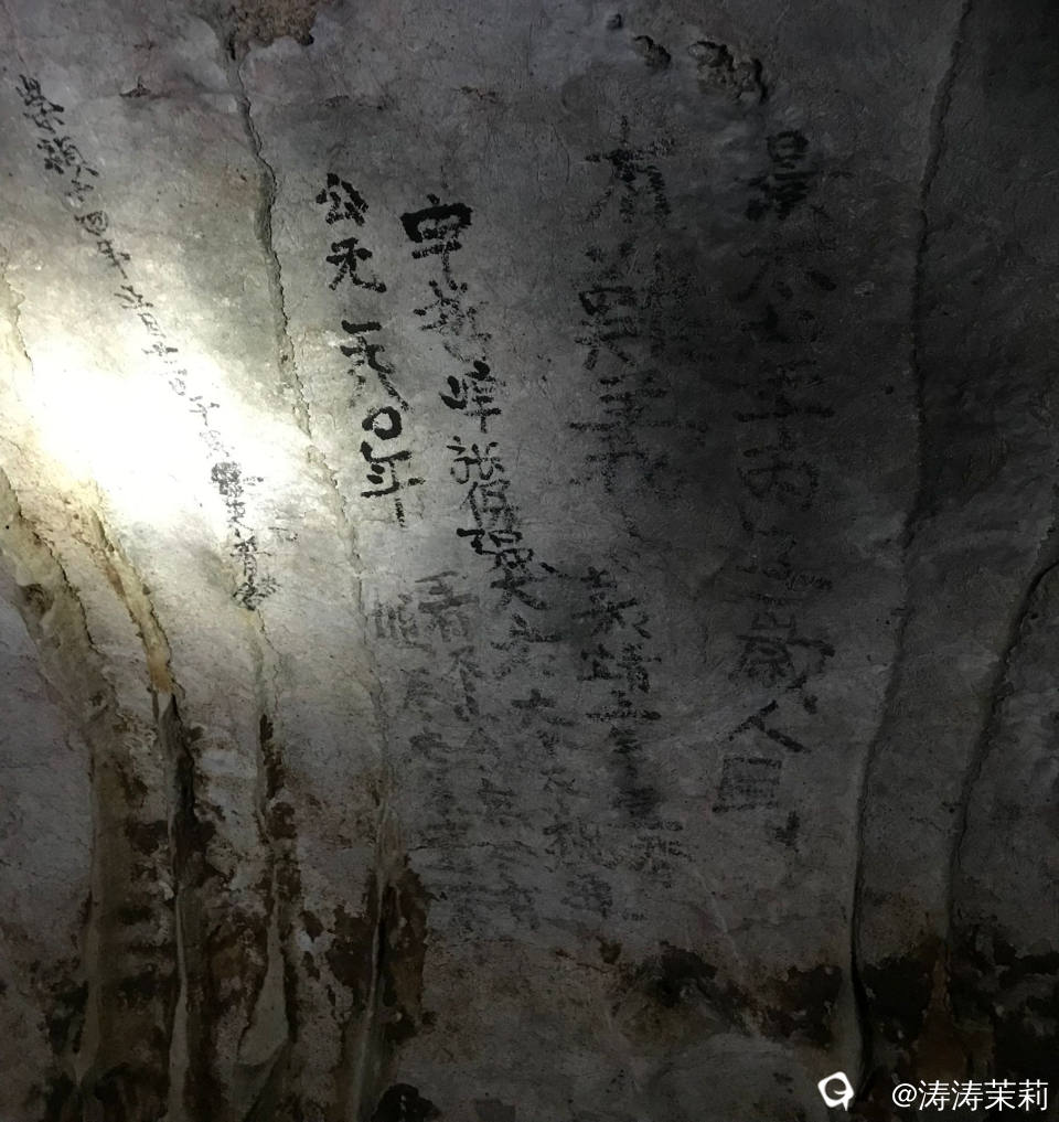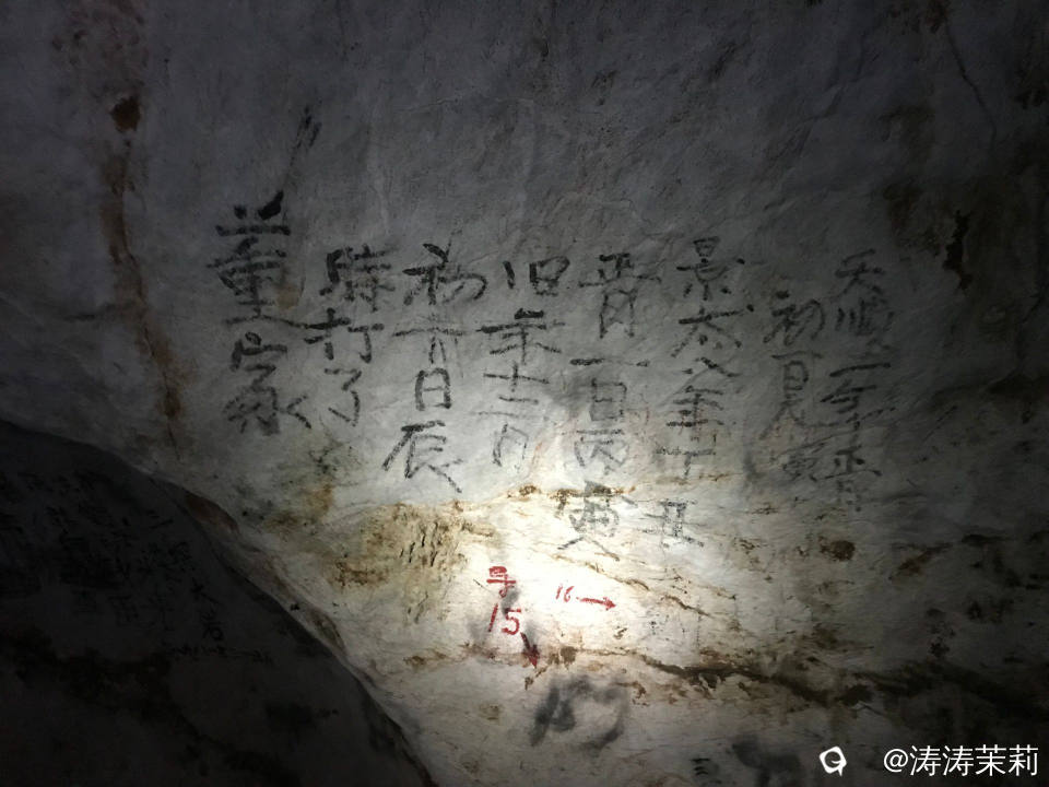 来到洞穴的深处就能看到我此行最好奇的大岩壁书!也许第一眼见到它的感觉是字迹潦草,平平无奇,但是想想明清以来,大岩是附近老百姓躲避天灾和战乱时的天然避难所。遥想几百年前的人们拖家带口匆忙中跑进洞内躲避,点着火把一脚深一脚浅的走向潮湿、阴暗的岩洞深处,他们不知道在这里要躲避多久?食物够不够?会不会被搜到后小命不保?.......在这样疲惫又提心吊胆的日子里,他们在大岩的深处留下了这些墨迹,值得我们细细品读。