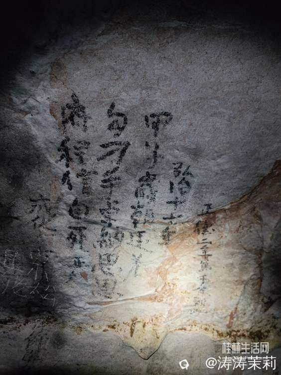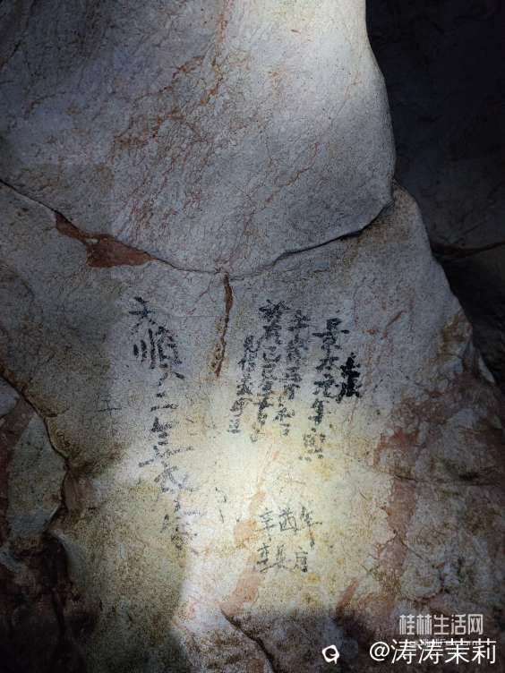 景泰七年即公元1456年,据《明史.五行志》记载,这年5月“桂林疫死者2万余人”。想想那时水深火热之中的人们,被贫穷和疾病折磨,疫情爆发得不到有效医治,仅仅桂林一地就死了2万余人。虽然后面的内容已被流水侵蚀,但据洞中其它同年的壁书记载推测,可能写的是義宁人民起义。