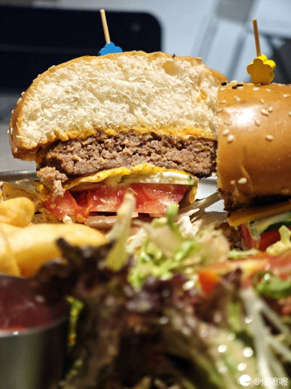 一份汉堡套餐会把汉堡切成两份,分量真的很大,套餐还包含了现炸薯条和蔬菜沙拉,解腻也稍微健康一点点。