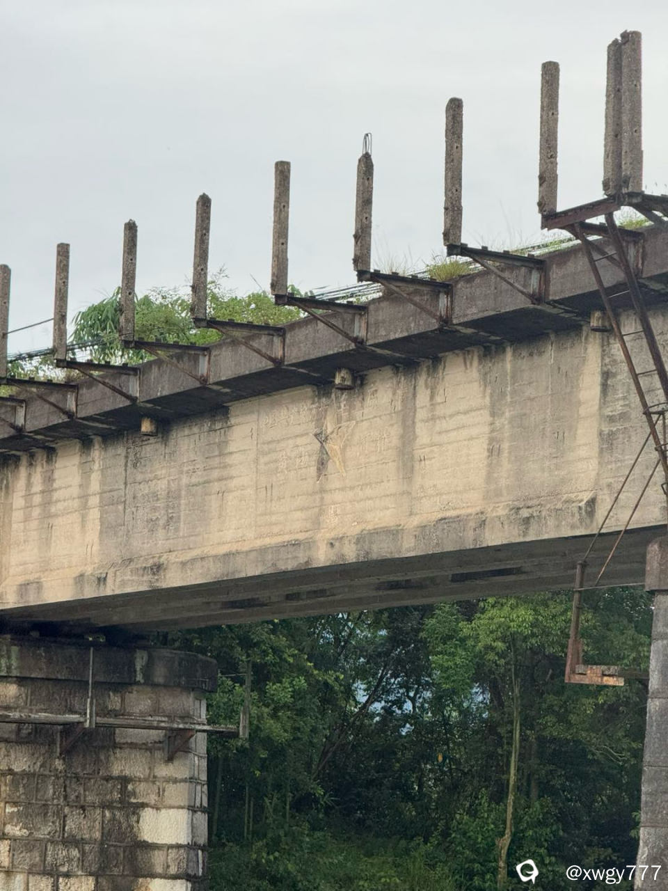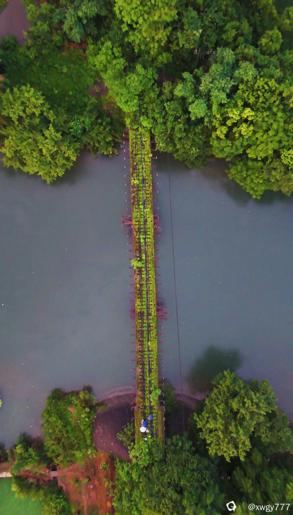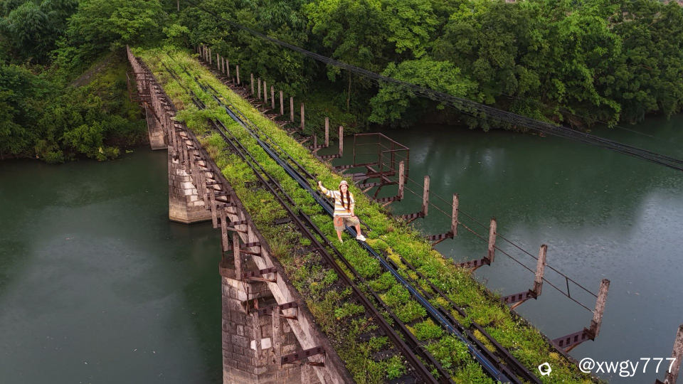 从无人机视角来看看这座铁路桥,这座铁路桥被绿植覆盖,铁轨与桥身交织,恰似一条巨型蜈蚣横跨在江面上,桥面上裸露的护栏是它蠕动的腹足,锈迹斑斑的桥身如坚硬外壳,纵向延伸的铁轨是脊梁,在河流与丛林间,以沧桑之姿,诉说着岁月故事,呈现出一种废弃又充满生机的独特质感。据查询铁路桥建于1971年。距今已有54年的历史了,想当年轰轰烈烈的铁路桂海线是如何的繁忙与辉煌,而今已经被淹没于荒草之间,成为一个时代的记忆。