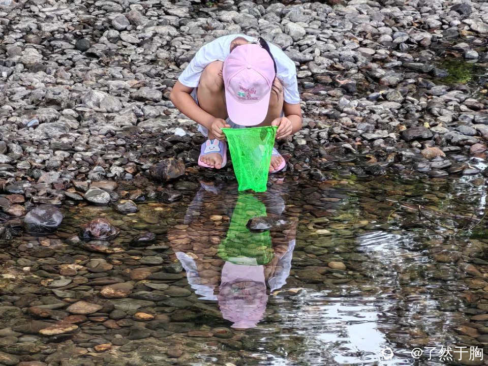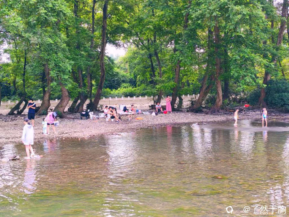 林中浓荫蔽日,凉风习习,很是适宜于休闲烧烤。河滩水流清浅,水下石子游鱼可数,最是孩子们的所爱。因而整个岭尾渡河滩,成了大人孩子们的娱乐园。
