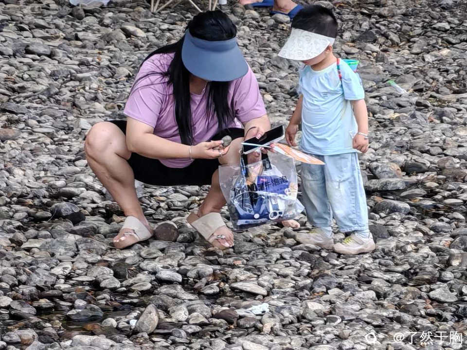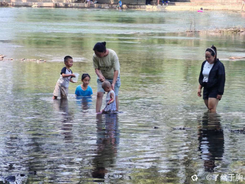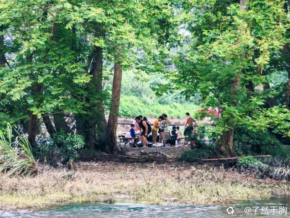 因为已是连续两天未下暴雨,甘棠江水落石出,因而山口村甘棠江岭尾渡河滩上的榉杨林中,成了人们休闲戏水,摸鱼纳凉,烧烤避暑的胜地。