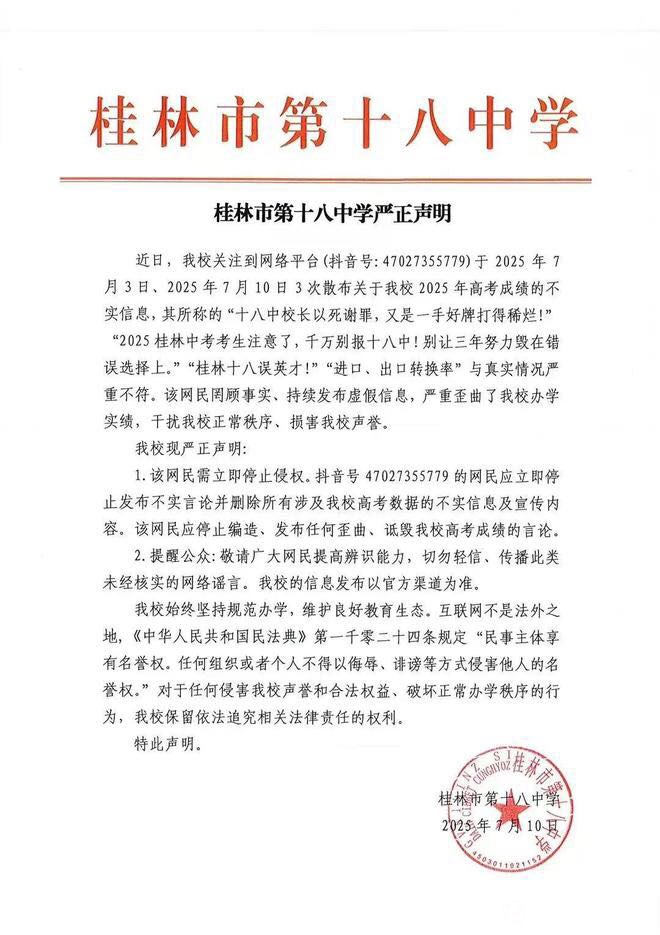 7月10日,桂林市第十八中学针对某网络社交平台账号于7月3日、10日多次发布关于“桂林十八中2025年高考成绩的不实信息”一事发布严正声明。