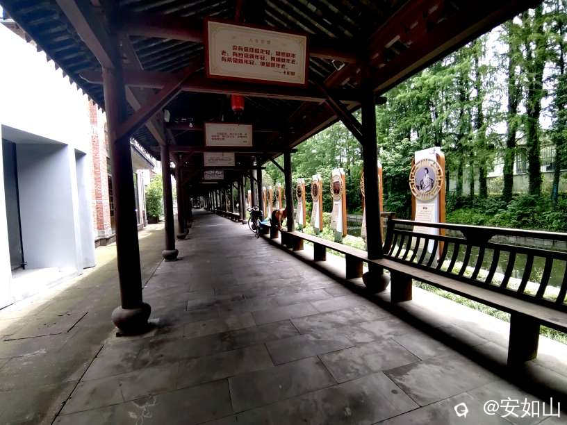 西江古村里的民国老街,一条沿河长廊为游客遮风挡雨,长廊一则是民国样商铺食街,其中建有民俗博物馆和丝绸展示館,甚至庙宇和戏台俱全,也许是周边无大片居民区的缘故,来这游览的游客廖廖,店铺没全开,我们的游览也是走马观花