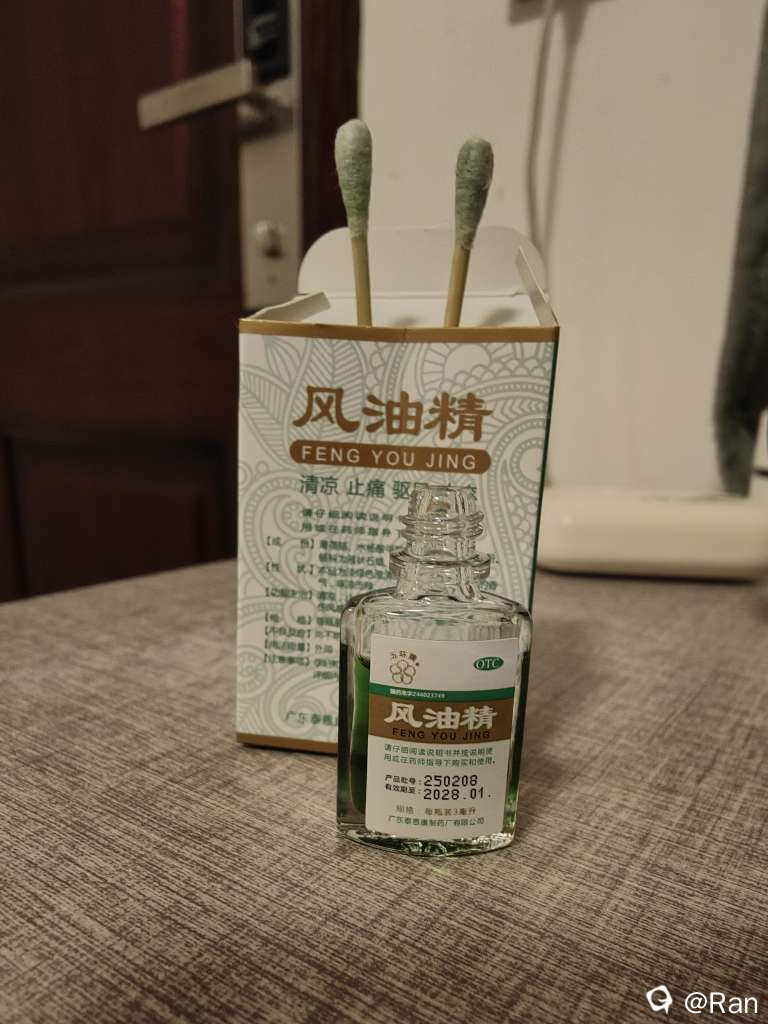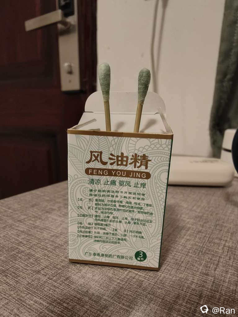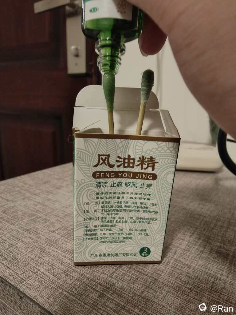 本来应该把棉签放进风油精里面的,但是我买的风油精有点小,只能把它涂到棉签上了