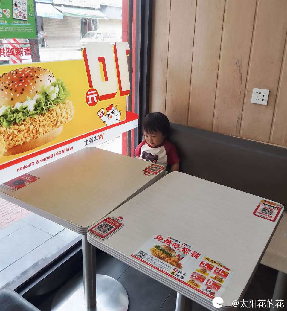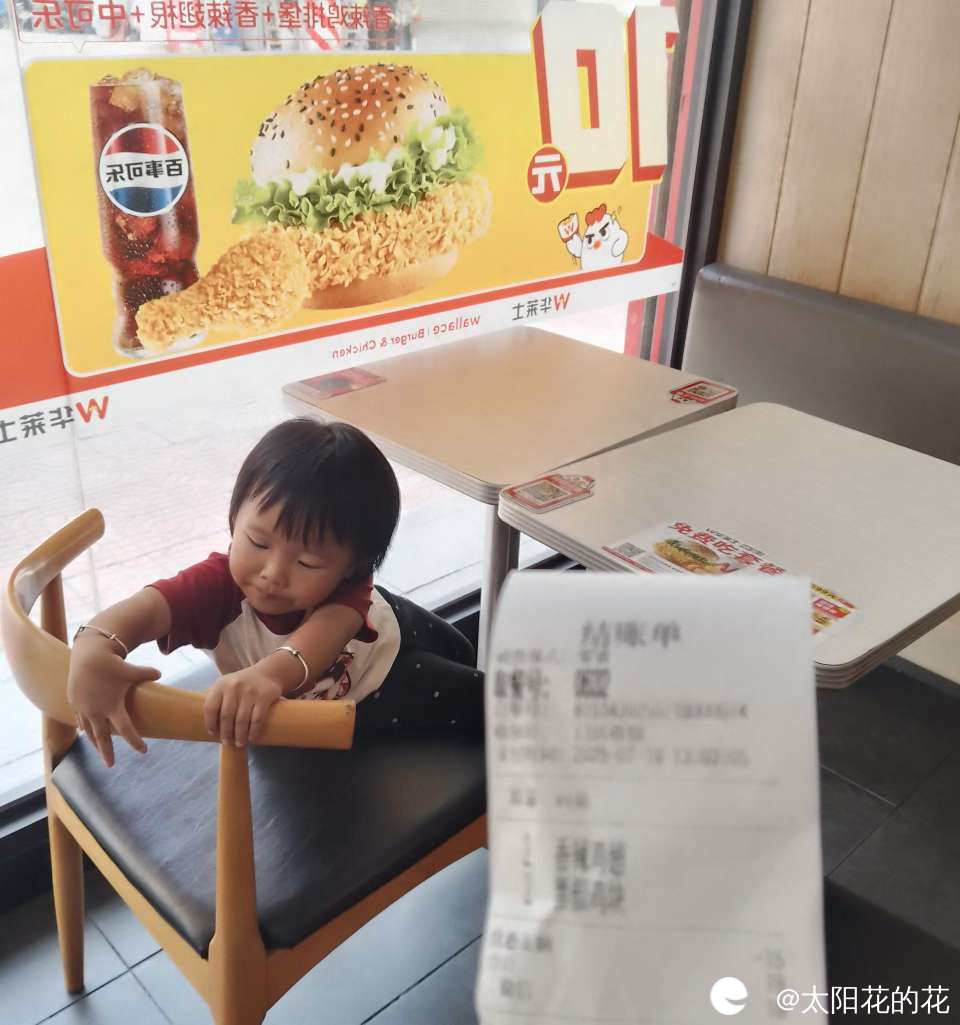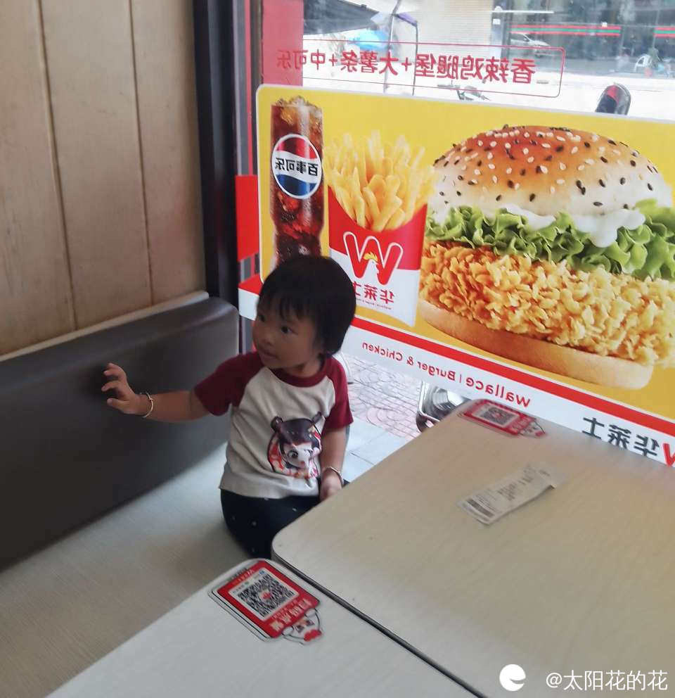 中午吃完饭叫小朋友睡午觉,小朋友莫名其妙哭了起来,我问她怎么了,她说要去吃炸鸡,原来是早上我和她说中午带她去买炸鸡吃她一直记着,来到店里我去点东西了她就在旁边找了个位置坐好了,开开心心的笑了……