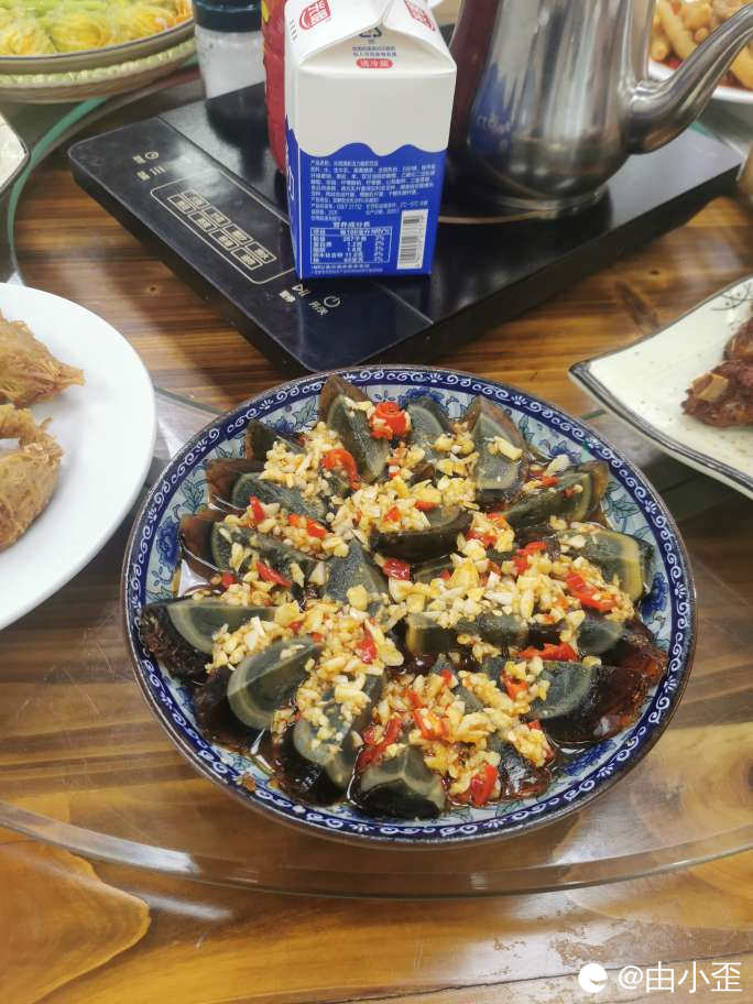 凉拌皮蛋,蒜泥和红辣椒淋上香油特别的香,皮蛋个大饱满,吃了一瓣还想吃。