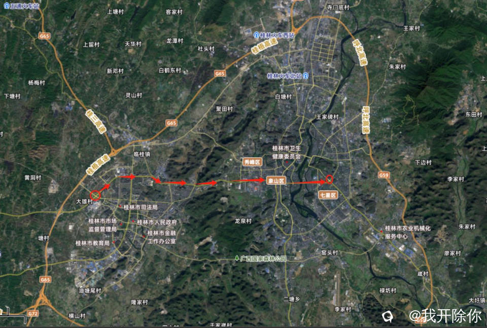 很多城市都有地铁、快速路,而桂林城区摊的饼太大了,目前又没有一条象样的环城路,也没有快速路,建议政府先把机场路改造成城市快速路(如图),这样把桂林机场和南站串联起来,同时也方便老城区与新城区上下班的快速通行。