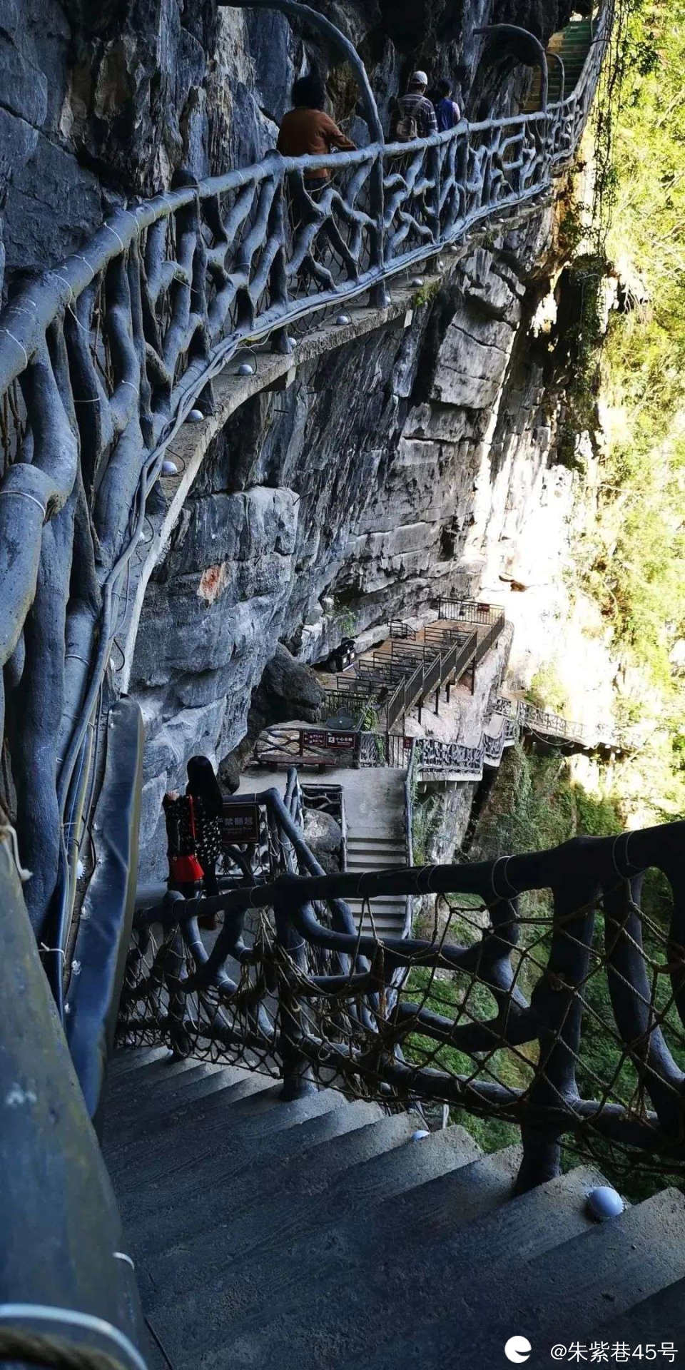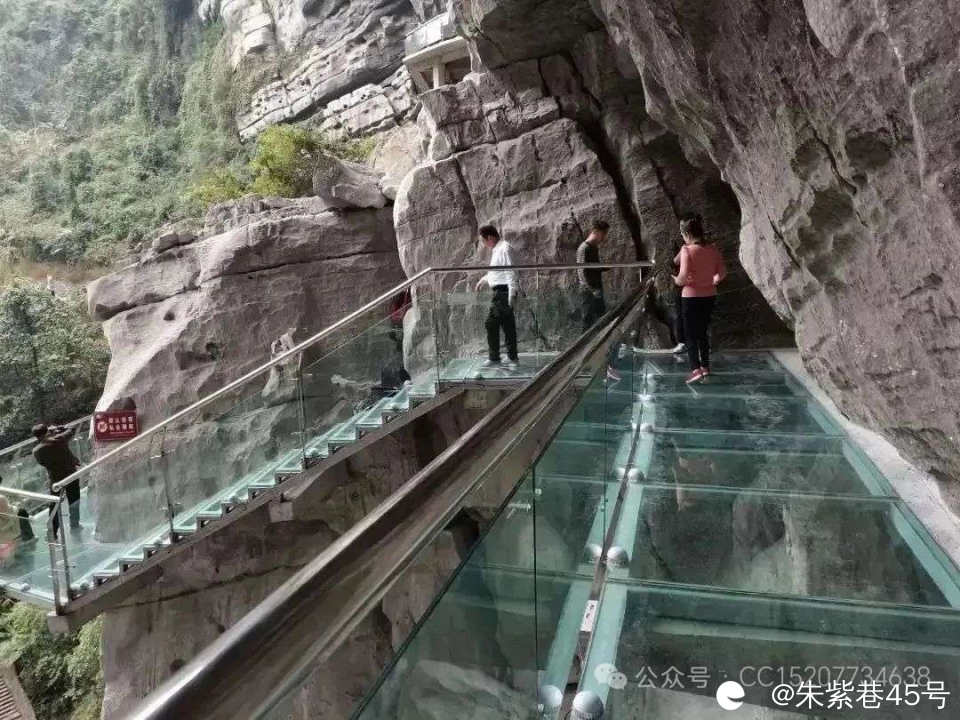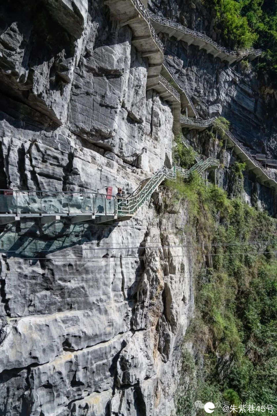 此外,还有 800 多米的悬崖步行石栈道,以及建在悬崖峭壁上的【玻璃栈道】,总长 98 米,脚下就是气势磅礴的百米峭壁和秘境天坑,让人胆战心惊的同时,又享受着移步换景的非凡体验。
