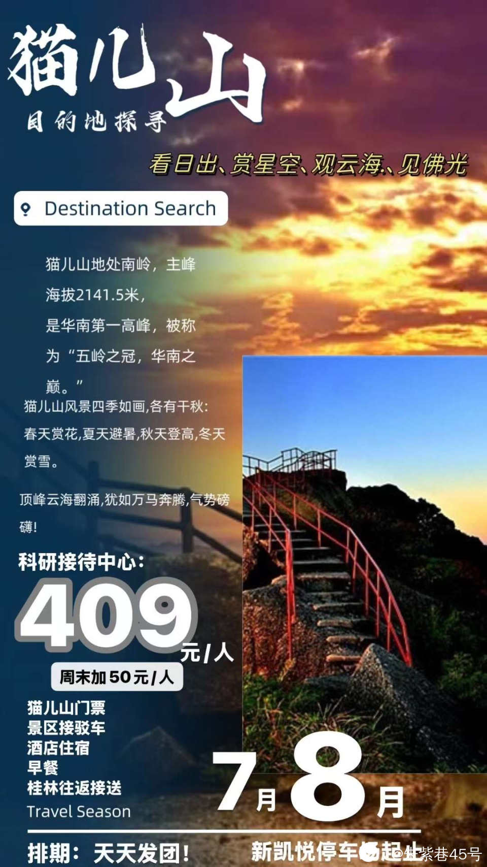 午餐建议:游客中心周边农家乐(费用客人自理,人均约40-60元)13:30-15:00乘景区观光车上山(含门票)沿途必打卡景点:竹海梯田:层层叠翠的竹林画卷红军亭&老山界:重走长征故道,感受红色历史三江源:漓江、浔江、资江的源头交汇处美军飞机失事纪念碑:二战历史遗迹15:00-18:00登顶华南之巅 徒步登顶(单程约1.2公里,阶梯路30-40分钟)观景推荐:佛光、云海、日落、晚霞(建议穿防风外套)18:30入住山顶云峰阁酒店/帐篷- 酒店含早餐,帐篷需自备防寒衣物(夜间气温低至10℃)住宿:山顶云峰阁酒店    用餐:无