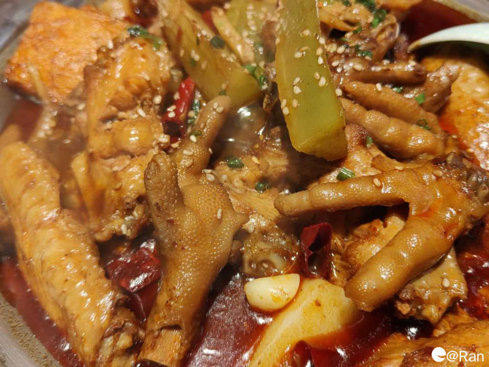 鸡翅煲整体来说还不错,我们选的是香辣锅,里面配菜也很丰富,有莴苣、豆腐、玉米、鹌鹑蛋和年糕,这么一锅两个人吃刚刚好。