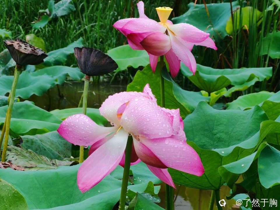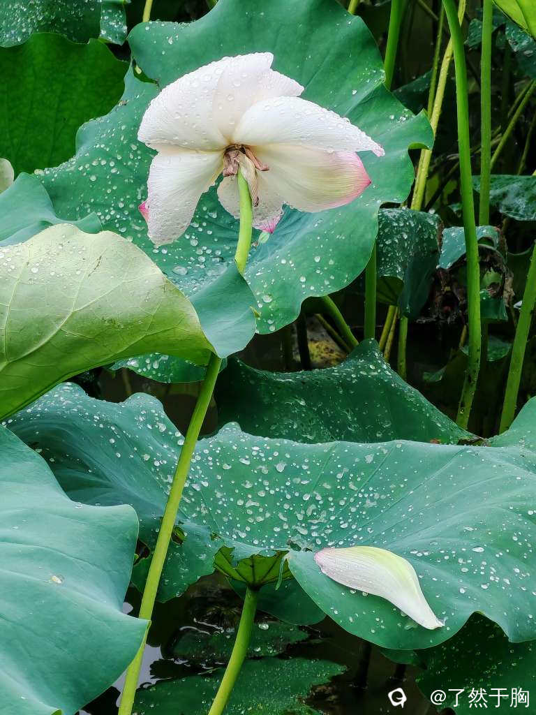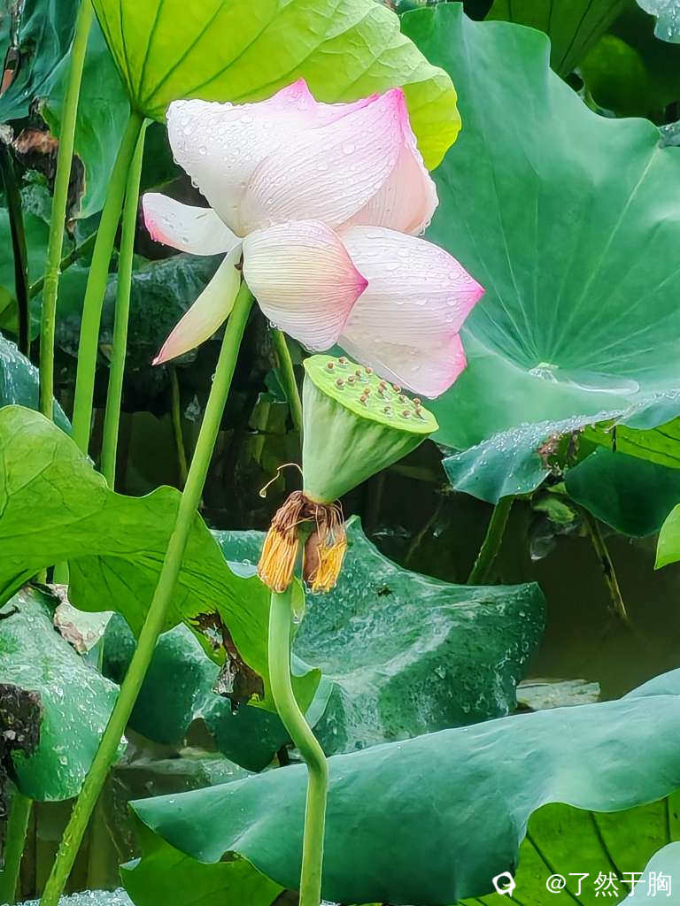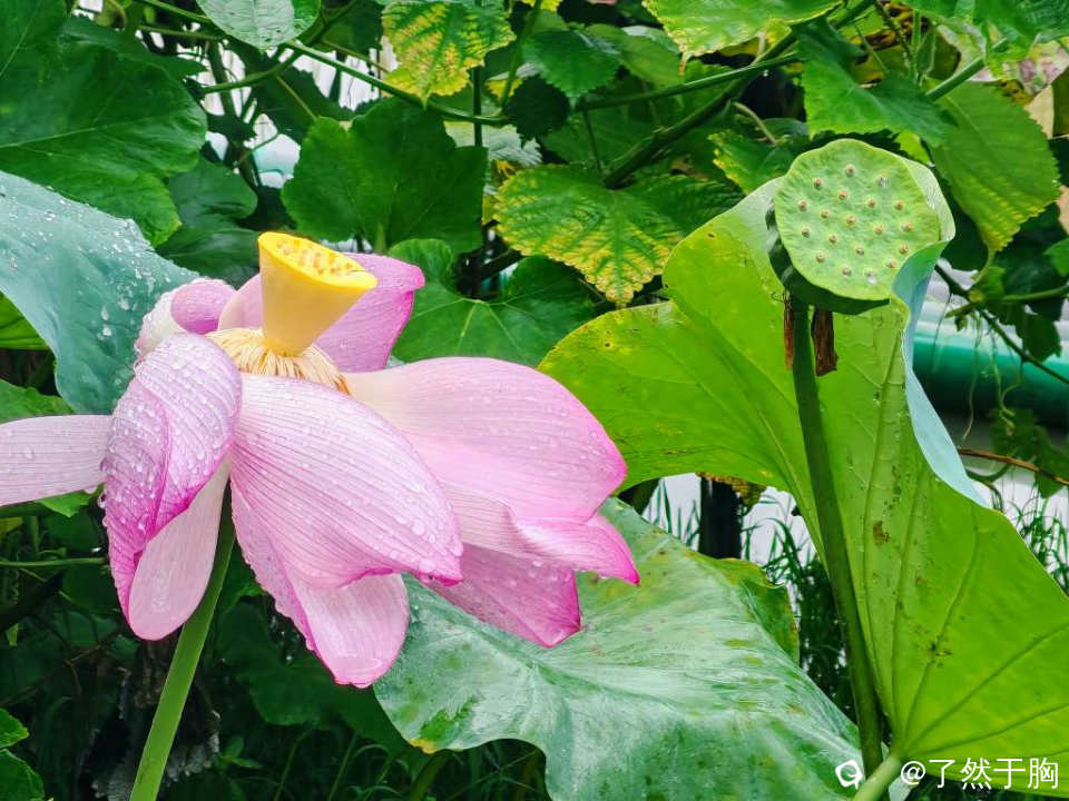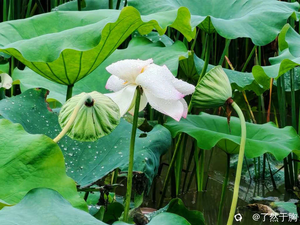 放眼望去,虽说依旧是满池荷花,但却大多已成残荷。不过荷花带雨,莲蓬低垂,荷叶含珠,却是很让人治愈呢。