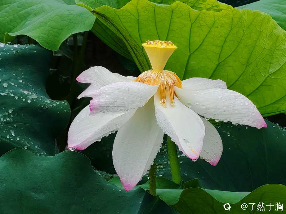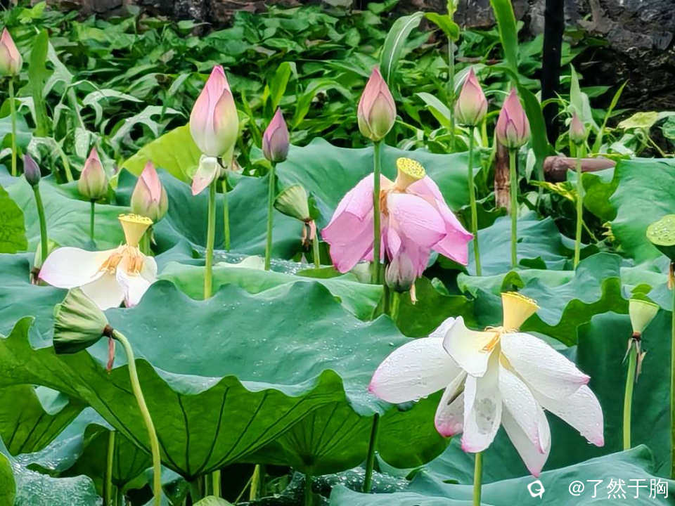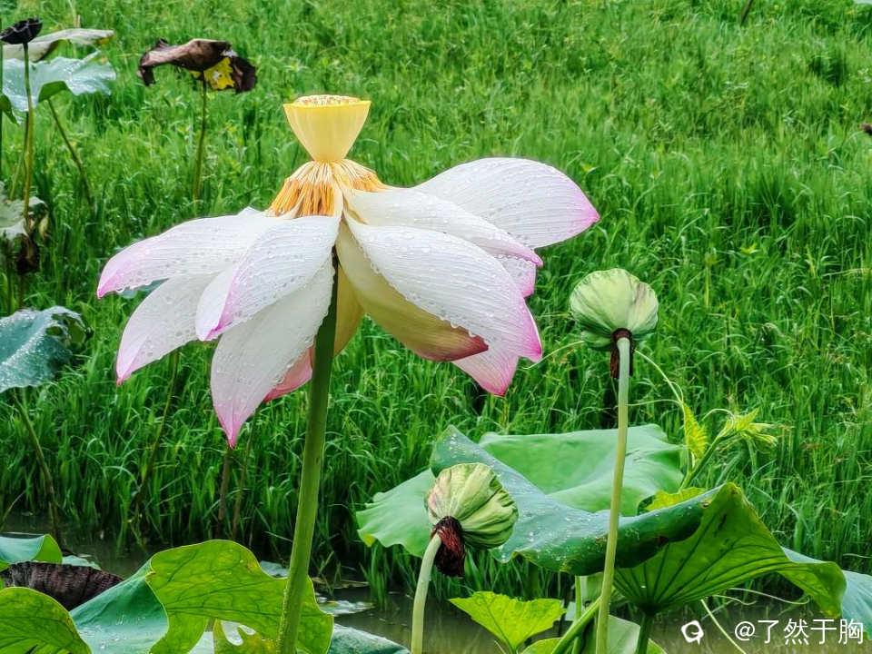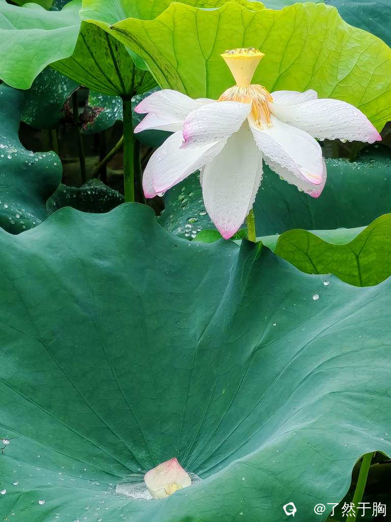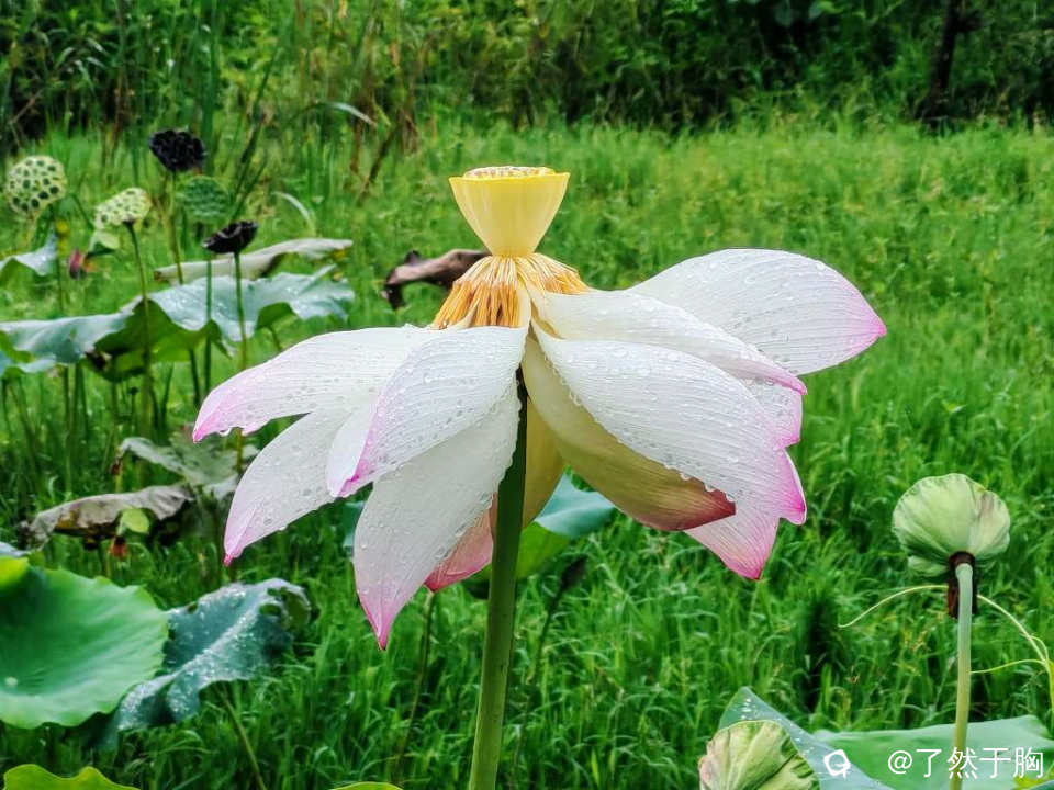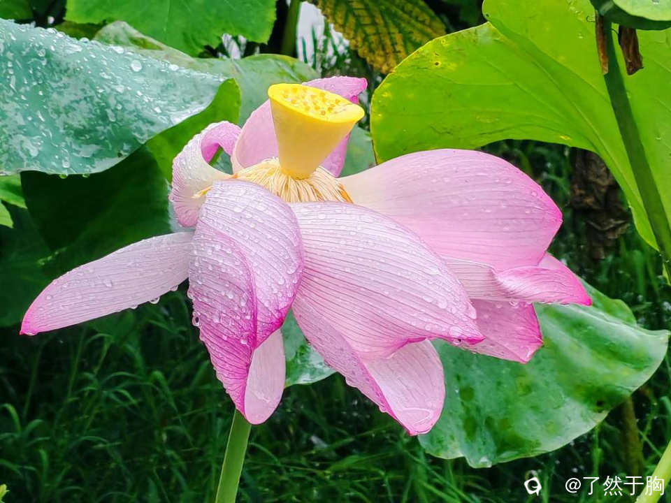放眼望去,虽说依旧是满池荷花,但却大多已成残荷。不过荷花带雨,莲蓬低垂,荷叶含珠,却是很让人治愈呢。