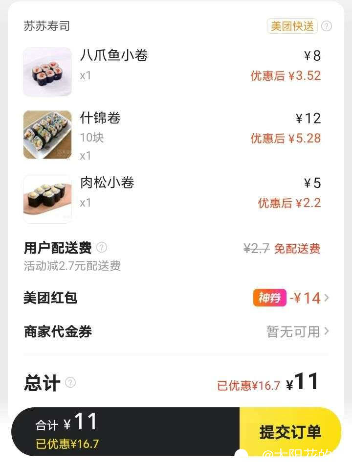 玩回家感觉肚子好饿啊,昨天用优惠劵下了个美团外卖预约单,玩饿了回家吃寿司……