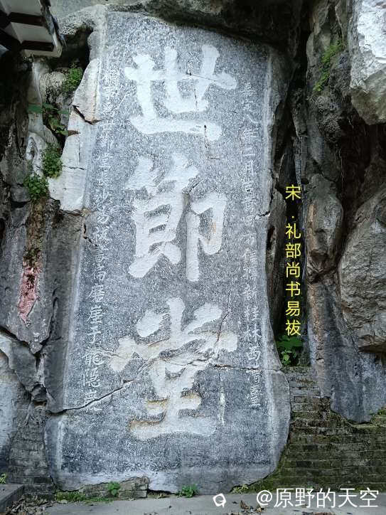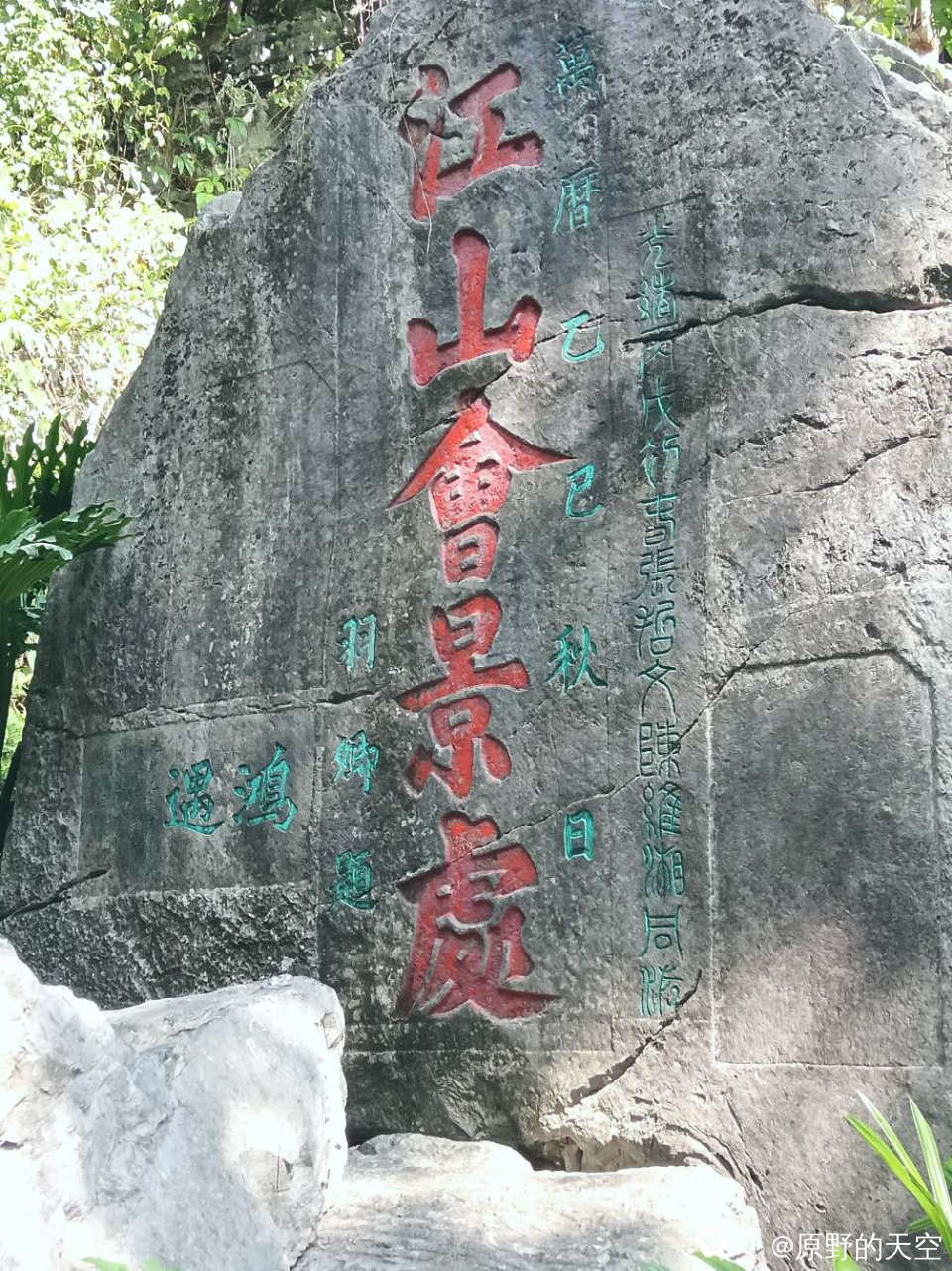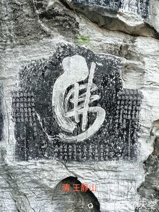 位于叠彩山的“江山会景处”,为明朝万历年间一位武官所题,这幅楷书气势磅礴,起笔剑拔驽张,行笔似铁骑奔腾,收笔如刀锋入鞘。字里行间透着武官干脆利落、粗犷、豪迈的风格。其笔画沉稳、坚实厚重,蕴含着作者心中刻着山河永固的坚定信念,对江山社稷无限忠诚的家国情怀。